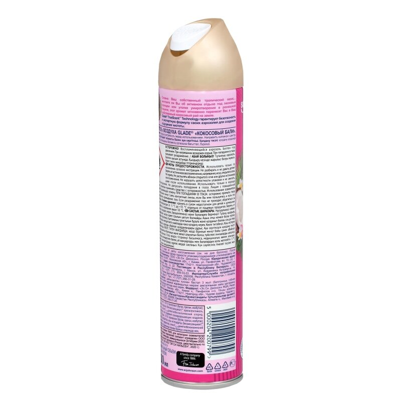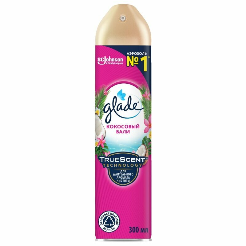 Glade – бренд №1 в России в сегменте базовых аэрозолей.* Описание аромата: Словно Ваш собственный тропический оазис… Мечтаете ли Вы об активном отдыхе под ласковым солнцем или уголке умиротворения в роскошной тишине, этот аромат мгновенно перенесет Вас с Ваш собственный кокосовый рай на Земле. Преимущества продукта: • “True Scent (ТМ) Technology” гарантирует безопасность и экспертную формулу своих аэрозолей для создания ощущения чистоты • Парфюмерные композиции с эфирными маслами • Борется с неприятными запахами • Действует мгновенно • Ароматы высокого качества, разработанные лучшими парфюмерными домами мира • Перерабатываемая упаковка *На основании данных Nielsen RMS для категории освежителей воздуха в сегменте базовых аэрозолей (сегмент определен ООО «Эс. Си. Джонсон») за 12 месяцев, завершившихся Октябрем 2020, для общего рынка розничной торговли в России, действительно по состоянию на 23.11.2020. ((с) ООО “ЭЙ СИ нильсен”, 2020 г.) Способ применения: Хорошо встряхнуть перед использованием. Направить колпачок к центру комнаты и распылить. Осторожно! Воспламеняющийся аэрозоль. Баллон под давлением. При нагревании возможен взрыв. При попадании в глаза вызывает раздражение. Меры предосторожности: Использовать только по назначению согласно инструкции. Не разбирать и не давать детям! Беречь от источников воспламенения, нагревания, источника искр, открытого огня. Не курить. Не распылять вблизи открытого огня или других источников воспламенения. Не нарушать целостности упаковки и не сжигать, даже после использования. Использовать только в хорошо проветриваемых помещениях. Не допускать попадания в глаза. Лицам с повышенной чувствительностью к ароматам применять средство с осторожностью. Использование освежителя воздуха не заменяет надлежащую гигиену. При попадании в глаза: Осторожно промыть под водой в течение нескольких минут. Снять контактные линзы, если Вы ими пользуетесь и если это легко сделать. Продолжить промывание глаз. Если раздражение глаз не проходит, обратиться за медицинской помощью. Состав: Вода; больше или равно 15% но не менее 30%: пропеллент (бутан, пропан, изобутан); менее 5%: н-ПАВ, фосфаты, отдушка(гексилциннамаль)**, пропиленгликоль, гидроксид аммония, алкилС12-16диметилбензиламмоний хлорид.**Потенциальные аллергены. Не содержит озоноразрушающих хладонов. Условия хранения: Хранить в сухом, недоступном для детей и домашних животных месте при температуре от -5 до +35 градусов, отдельно от пищевых продуктов. Беречь от солнечных лучей, избегать нагревания выше 50 С. Срок годности: 3 года от даты изготовления. После использования или по окончании срока годности упаковку/содержимое утилизировать как бытовые отходы. Изготовитель ООО "Эс. Си. Джонсон" 141407, Россия, Московская обл, г. Химки, ул. Панфилова, вл. 19, стр. 1