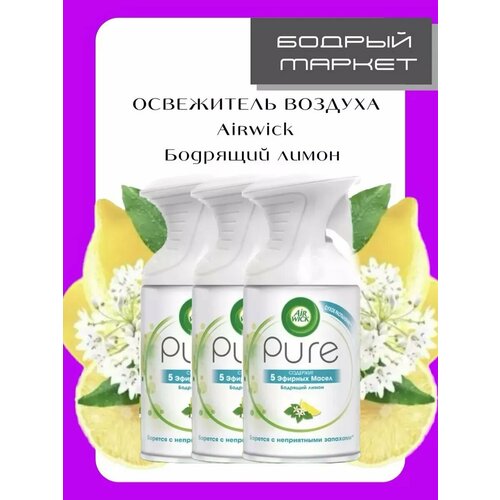 Комплект 3шт. Освежитель воздуха с ароматом Бодрящий Лимон 250мл не содержит воды и эффективно устраняет неприятные запахи без мокрого распыления. Используйте освежители воздуха Air Wick Pure в каждой комнате, наполняя ваш дом свежими и приятными ароматами. Хранить в недоступном для детей и животных месте. Использовать с осторожностью при повышенной чувствительности к парфюмерным отдушкам. Освежитель воздуха не является заменой надлежащих мер гигиены. Использовать только в хорошо проветриваемых помещениях.
