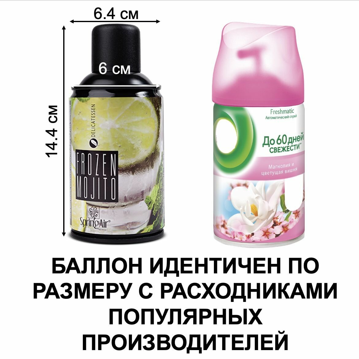 Аэрозольный ароматизатор-освежитель воздуха от греческой компании Spring Air со вкусом освежающего напитка Мохито. Потрясающая свежесть! Невероятно точное воспроизведение аромата мяты. Желание глубоко вздохнуть и задержаться в этой прохладе не покинет вас. Прямой телепорт в лето и отпуск. Вы можете распылять этот аромат как вручную, нажатием на клапан-дозатор, так и через диспенсер, задав график распыления аромата и интенсивность ароматизации.