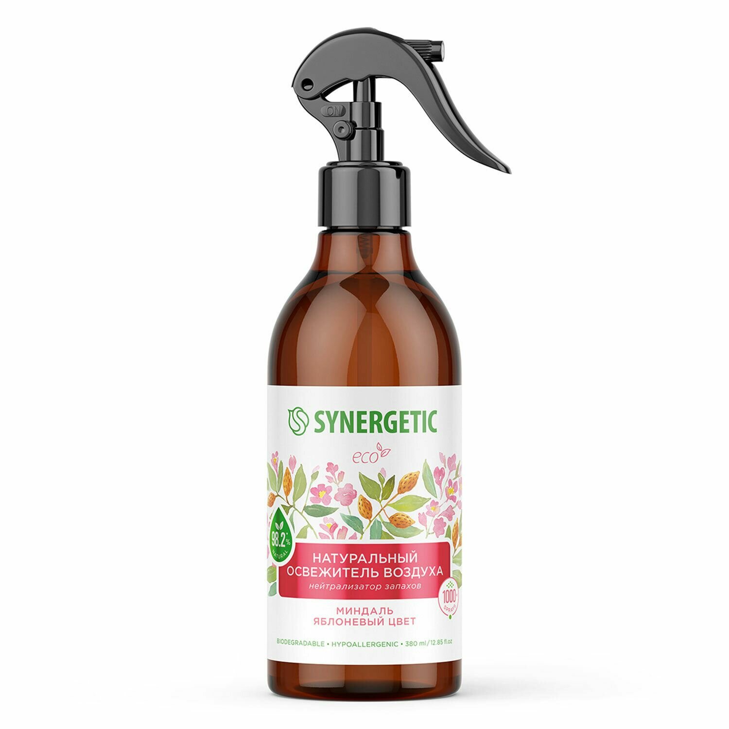 Освежитель воздуха Synergetic Миндаль и яблоневый цвет 380 мл. Назначение/Особенности: биоразлагаемый освежитель воздуха, нейтрализатор запахов Synergetic 'Миндаль и яблоневый цвет' на водной основе на 98,2% состоит из натуральных компонентов. Парфюмерная композиция с эфирными маслами бергамота, корицы и сандала наполняет воздух сладким цветочным ароматом. Гипоаллергенная формула безопасна для людей и животных. Благодаря 100% натуральному поглотителю запахов -соли полиитаконовой кислоты -освежитель эффективно устраняет стойкие запахи от приготовления пищи, домашних животных, табака и других источников неприятных запахов в гостиной, ванной комнате и санузле, спальне, коридоре, кухне, автомобиле, офисе и прочих помещениях. Подходит для устранения неприятных запахов с тканей (диванов, подушек, ковров, занавесок, простыней, тканевых автокресел, постельного белья), занавесок для душа и спортивных ковриков. Не оставляет следов на поверхностях, увлажняет воздух в помещении и способствует осаждению пыли. Не содержит парабенов, фреонов, газов-пропеллентов, фталатов и красителей. Способ применения: перед применением хорошо встряхните флакон. Нажмите до щелчка/упора на кнопку ОN. Держите флакон вертикально, распылите освежитель в помещении. Для удаления неприятного аромата с тканей распылите освежитель непосредственно на источник запаха. При необходимости повторите обработку. Перед распылением проверьте совместимость средства с обрабатываемой поверхностью на небольшом незаметном участке. Возможно выпадение естественного осадка и незначительное изменение цвета освежителя, не влияющие на его качество и свойства. Меры предосторожности: хранить отдельно от пищевых продуктов, в местах, недоступных для детей и животных. Избегать вдыхания при распылении, попадания в глаза и на поврежденные участки кожи. В случае попадания на слизистые оболочки обильно промыть водой и при необходимости обратиться за медицинской помощью. Использовать строго по назначению. Состав: подготовленная вода > 30%; гипоаллергенная парфюмерная композиция 'Миндаль и яблоневый цвет' с эфирными маслами бергамота, корицы и сандала < 5%; комплекс Н-тензидов (ПАВ из растительного масла) < 5%; поглотитель запаха (соль полиитаконовой кислоты) < 5%; изопропиловый спирт высокой степени очистки < 5%; консервант (бензоат натрия) < 5%. Условия хранения: хранить при температуре не выше 45 С. Средство замерзает, после размораживания и перемешивания сохраняет свои свойства. После размораживания рекомендуется хорошо встряхнуть флакон. Срок годности: 36 месяцев. Название аромата: Миндаль и яблоневый цвет; Ароматизация: Ручная; Класс опасности: 2 класс; Вид ароматизатора: Спрей; Срок годности в днях: 730; Аромат: Миндаль;