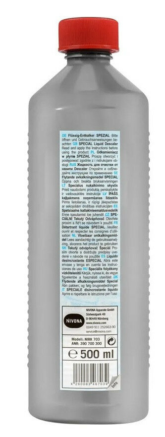 Профессиональное жидкое чистящее средство для удаления накипи liquid descaler 5 для всех моделей CafeRomatica, объем 500 мл. Удаляет накипь, не повреждая машину, смывается полностью, без остатка. Профессиональный уход и техническое обслуживаниеСпециальное жидкое средство для удаления накипи NIRK 703 (объем 500 мл) для моделей CafeRomatica, достаточно для 5 обработокПолностью автоматический кофе центр NIVONA имеет встроенную программу удаления накипи. Средство для удаления накипи NIVONA разработано специально для вашей кофе-машины, оно хорошо удаляет накипь, не повреждая машину. Специальное средство для удаления накипи NIVONA полностью смывается полностью, без остатка! Регулярная очистка от накипи защищает машину и позволяет сохранить полноту вкуса кофеПодлежит техническим изменениям и замене аналогичными моделями
