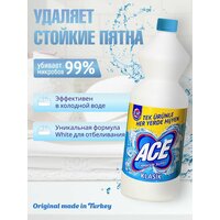 Оригинальный отбеливатель и пятновыводитель ACE предназначен для стирки в автоматических стиральных машинах, стиральных машинах активаторного типа и для ручной стирки. Активная молекула white легко справляется с пятнами и деликатно отбеливает ткани даже при низкой температуре стирки. Эффективен в холодной воде. Кроме того, средство обладает дезинфицирующим эффектом и убивает бактерии и вирусы. Эффективен против самых стойких пятен. Максимальное восстановление белого благодаря активной молекуле White Экстра защита ткани. Дерматологически протестировано. Убирает неприятные запахи. Средство также можно использовать и для домашней уборки: раковин, ванн, кафеля, мытья пола. Меры предосторожности: избегать попадания в глаза. При попадании немедленно промыть глаза проточной водой. Не глотать. При проглатывании обратитесь за медицинской помощью. Не предназначен для кипячения. НЕ применяйте ACE для шелка, шерсти, кожи, непрочно окрашенных тканей и маркированных специальном знаком.
