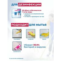 Для мытья и дезинфекции ванны, раковины и туалета используйте раствор 60мл (4 столовых ложки) на1л воды. Нанесите на обрабатываемую поверхность, оставьте на 60 минут, затем промойте водой. Не предназначен для кипячения. Эффективен в холодной воде.