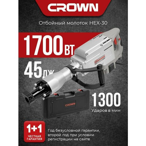 - Мощность: 1700 Вт - Патрон: HEX-30 - Количество ударов: 1300 уд/мин - Энергия удара: 45 Дж - Вес нетто: 15,3 кг - Упаковка: кейс - Гарантия: 1+1 (1 год дополнительной гарантии при условии регистрации инструмента в течение 28 дней со дня покупки)