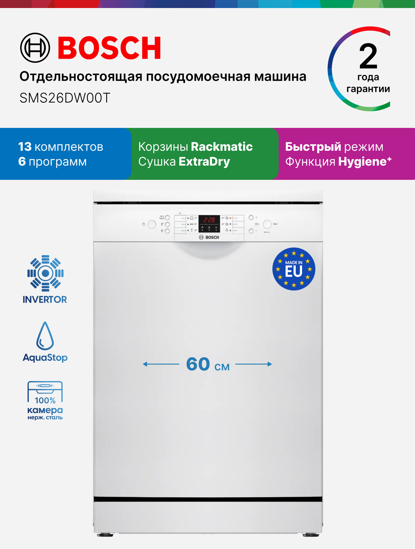 Отдельно стоящая посудомоечная машина Bosch SMS26DW00T, инверторный двигатель: сравнение цен, характеристики, фото, актуальное наличие и цены.