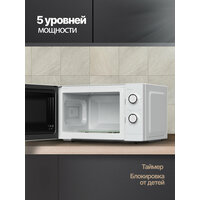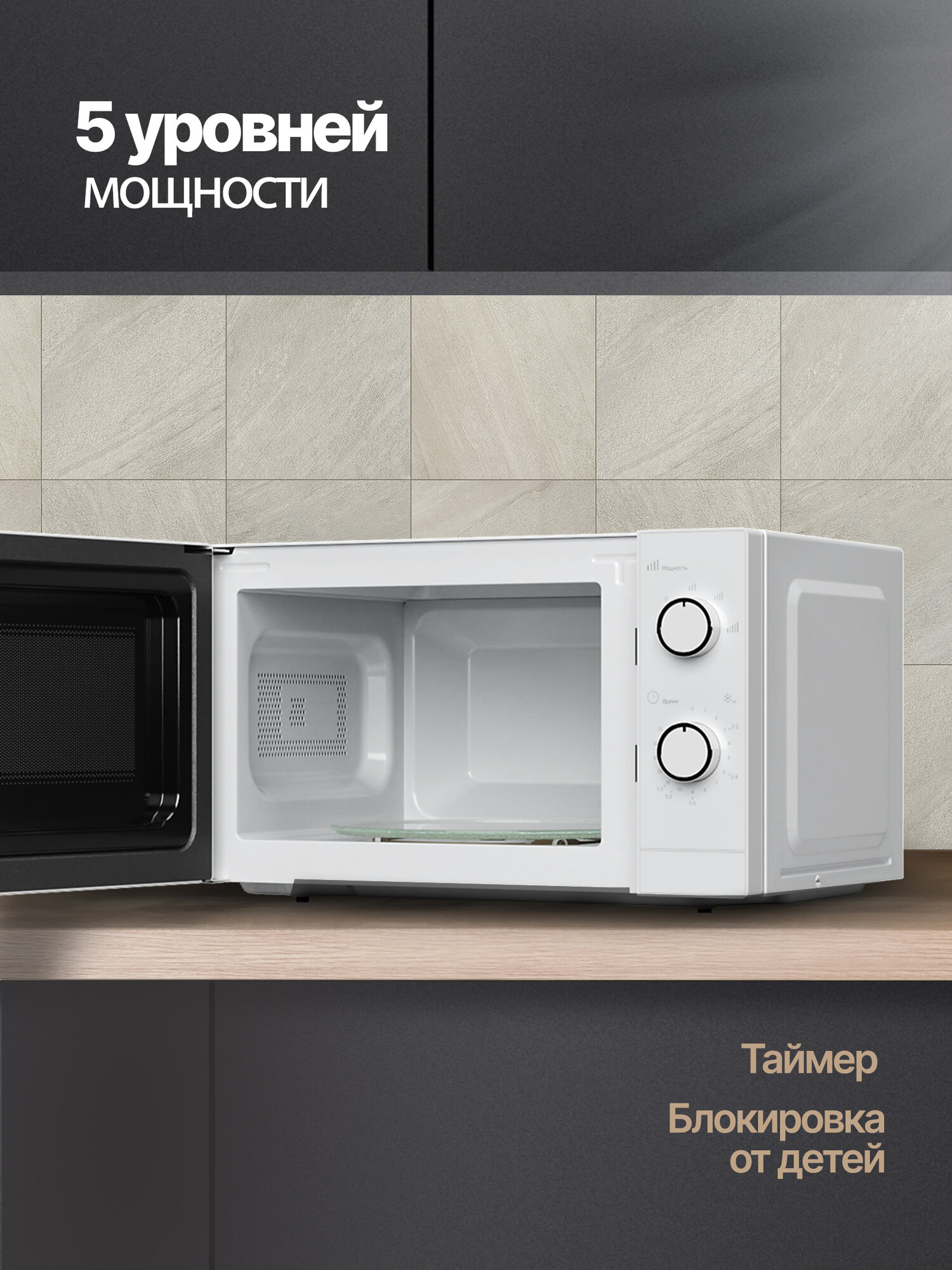 Объем камеры составляет 20 литров, а мощность микроволн – 700 Вт. 5 уровней мощности позволяют настроить микроволновую печь под ваши нужды. Механическое управление, размораживание, таймер и подсветка камеры делают эту микроволновую печь удобным и безопасным устройством.