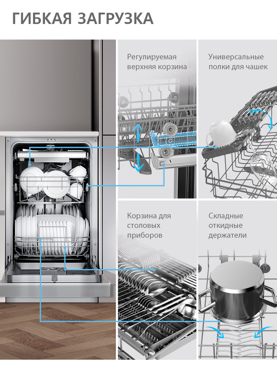 Несмотря на свою вместительность, Comfee CDW453Wi отличается компактными размерами и лаконичным дизайном. Белый цвет корпуса позволяет посудомоечной машине гармонично вписаться в любой интерьер кухни.