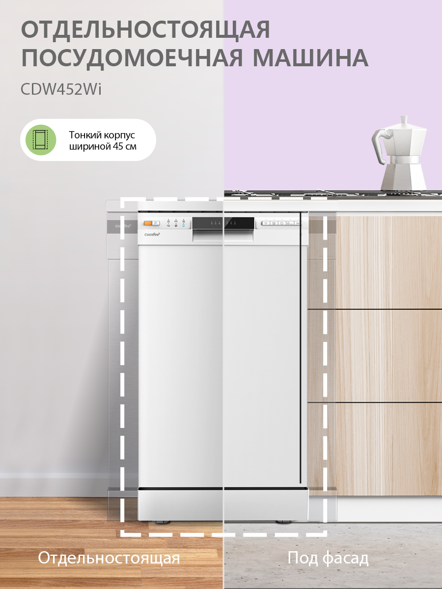Купить Отдельностоящая посудомоечная машина Comfee CDW452Wi, Wi-Fi, 8 программ, самоочистка, экспресс-мойка, отложенный старт с доставкой по всей России.