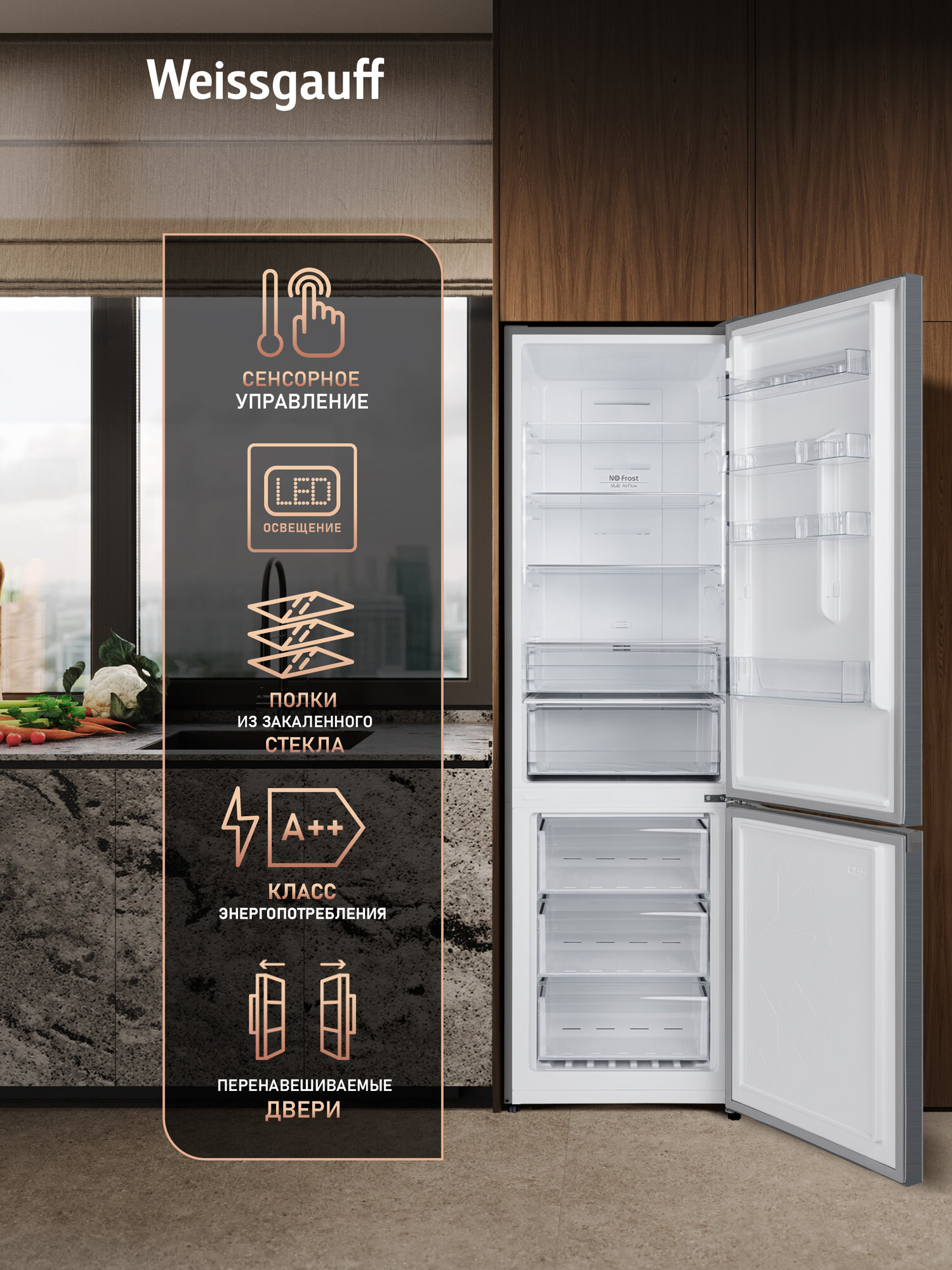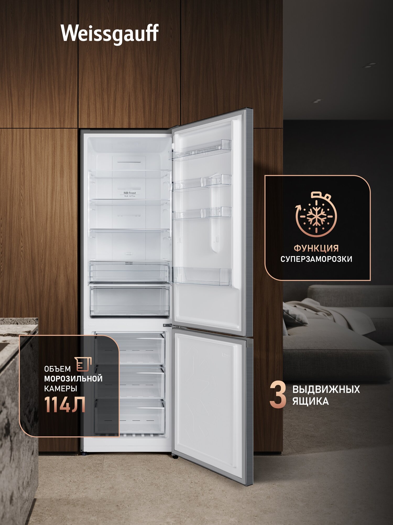 Отдельностоящий холодильник Weissgauff оснащенный инверторным двигателем, обладающий полной системой размораживания Full No Frost и фантастической вместительностью - это соотношение превосходной эргономики внутреннего пространства, технологического совершенства и великолепия внешнего дизайна!