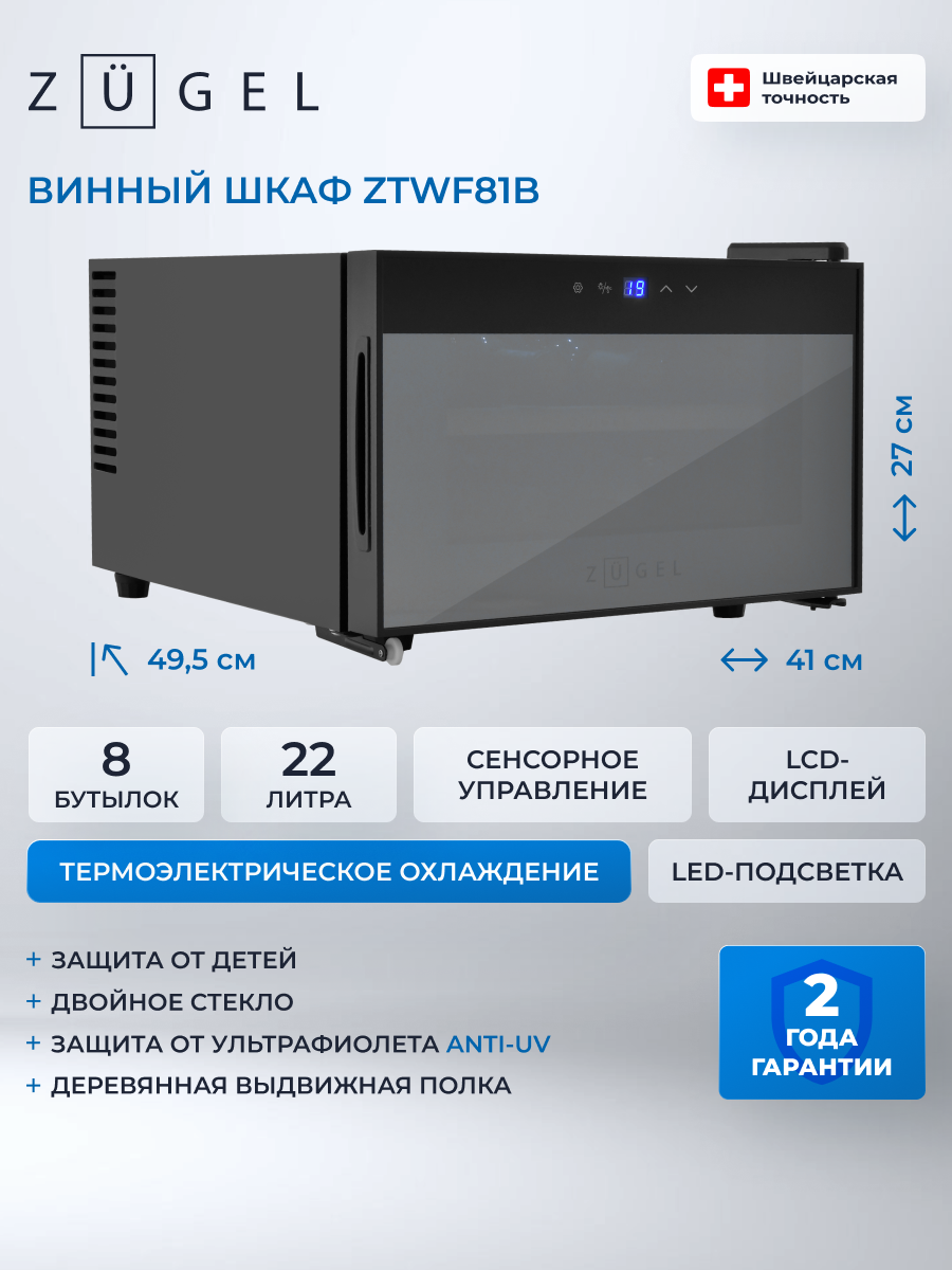 Отдельностоящий винный шкаф ZUGEL ZTWF81B, УФ тонировка стекла: сравнение цен, характеристики, фото, актуальное наличие и цены.