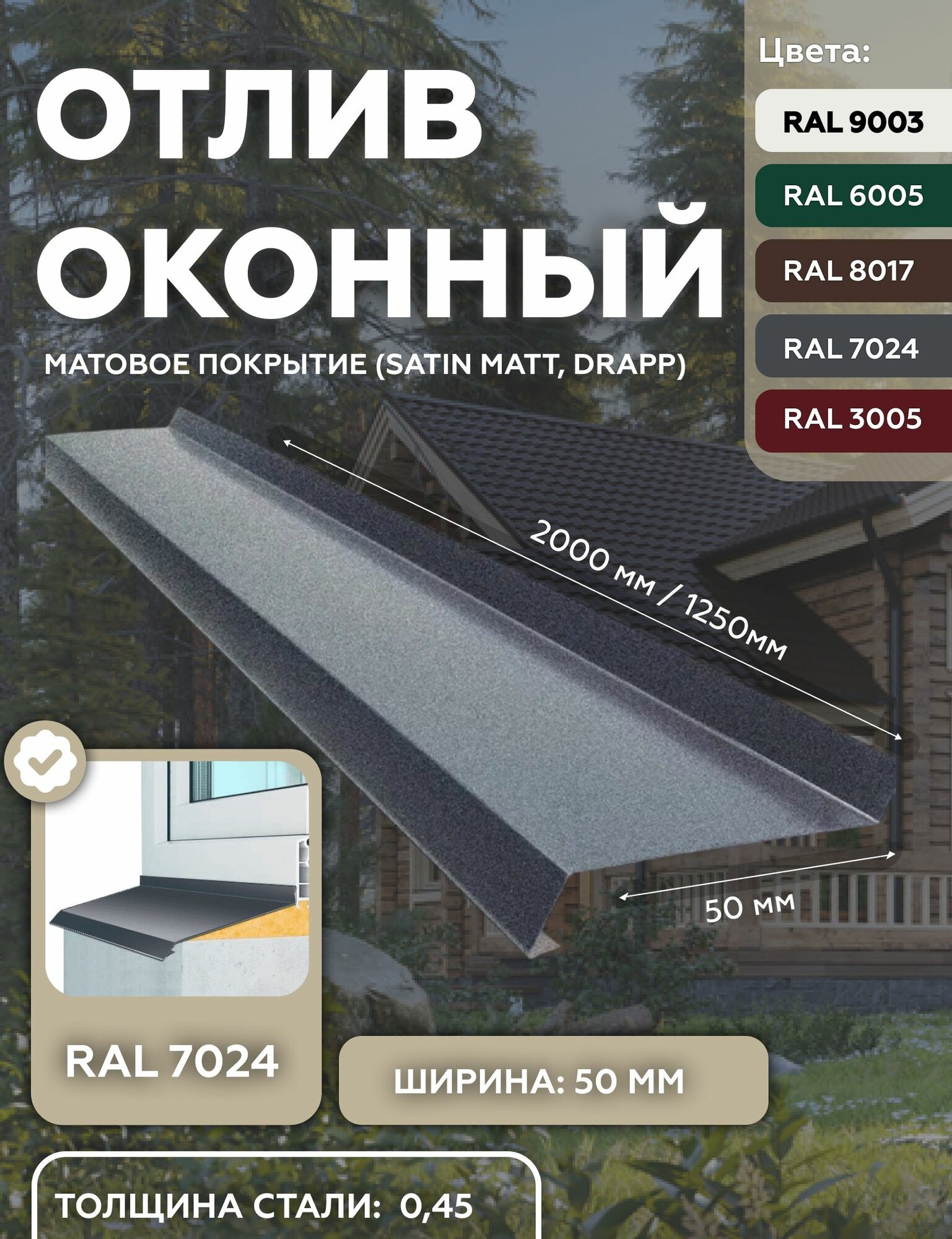 Отлив оконный 50мм матовый (Satin, Drap) RAL-7024 серый 2000мм 10шт: сравнение цен, характеристики, фото, актуальное наличие и цены.