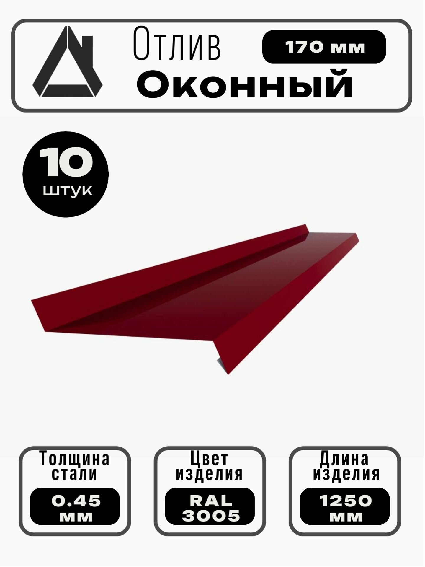 Отлив оконный длина 1250 мм ширина 170 10шт RAL 3005 Вишневый: сравнение цен, характеристики, фото, актуальное наличие и цены.