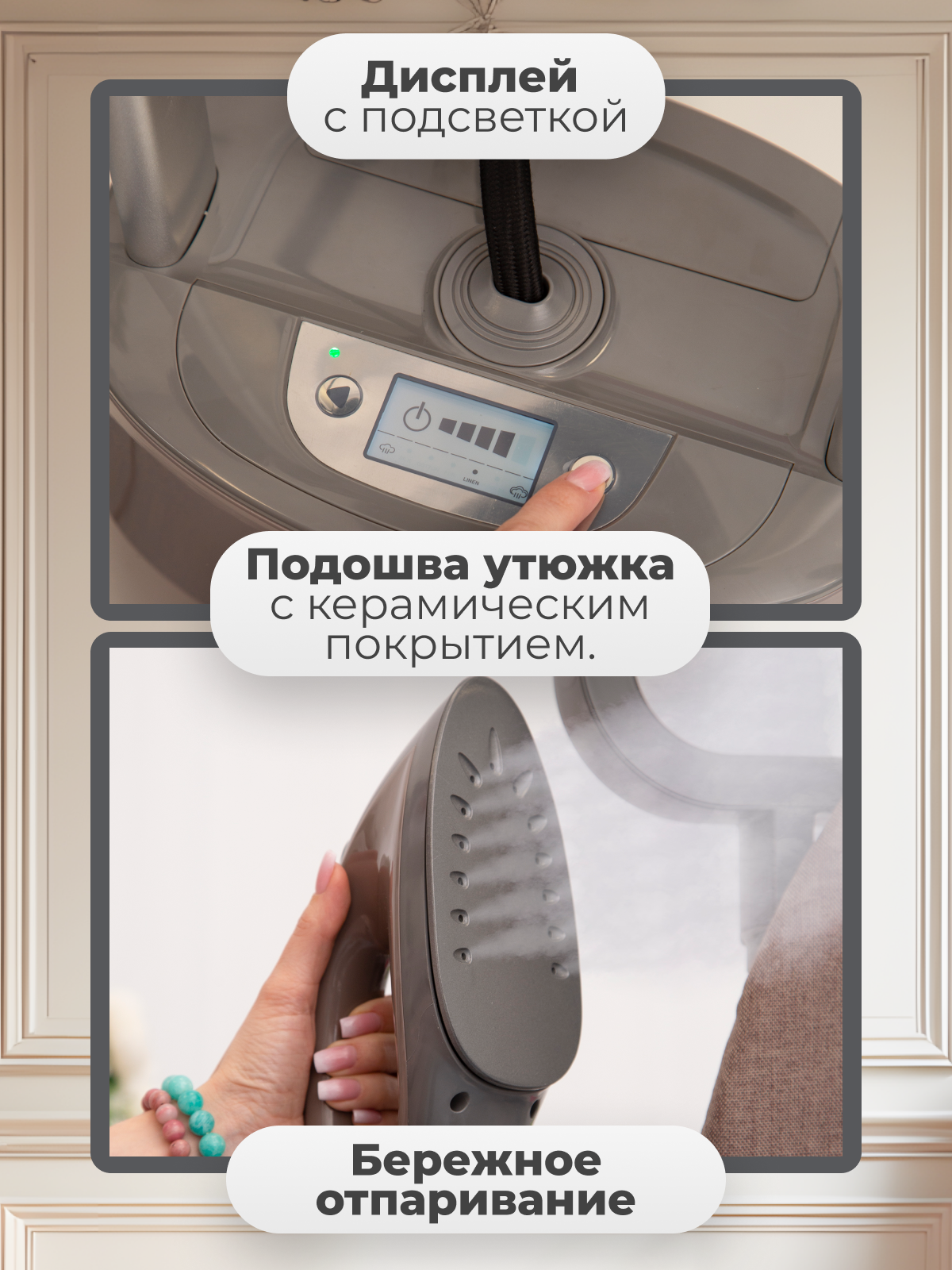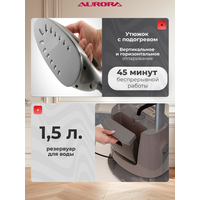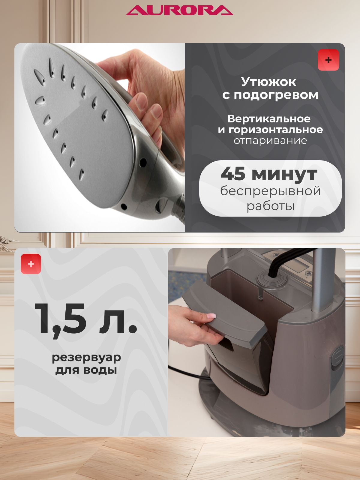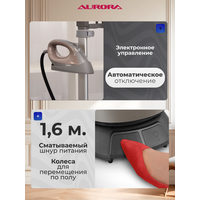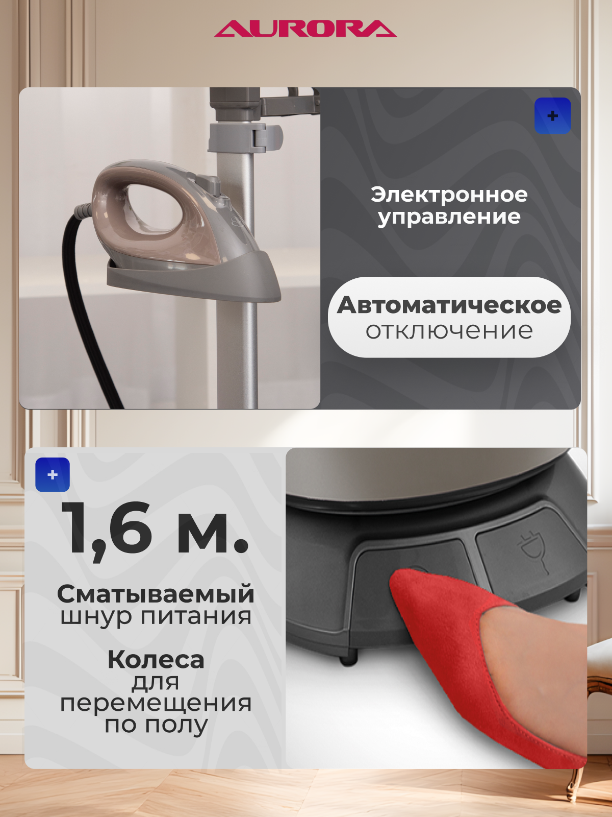 Отпариватель с гладильной доской Aurora Deluxe современный дизайн, качественная сборка, электронное управление. Подошва Coolfort Ultimate Care – уникальное керамическое покрытие, обеспечивающее сверхлегкое скольжение по ткани и бережное отпаривание. Новый отпариватель для одежды Aurora Deluxe создан для бережного ухода за самыми дорогими и деликатными вещами. С его помощью можно разгладить складки и удалить заломы на ткани, провести паровую дезинфекцию, увлажнить и придать мягкость одежде из любых тканей. Отпариватель Aurora Deluxe поможет в уходе за гардинами, мебельными обивками, натуральным мехом, удалит запах «ношеной» одежды. Стойка для размещения одежды отпаривателя Aurora Deluxe – двойная. Наверху стойки расположены плечики с подвесом для парового утюжка. Стойка регулируется по высоте. Двойная стойка предохраняет вещи из трикотажа, шерсти и других материалов, склонных к растягиванию, от деформации в процессе отпаривания. Объемные верхние вещи, такие как куртки, шубы и пальто, на такой стойке не съезжают и не перекашиваются. Отпаривать вещи, расположенные на двойной стойке с плечиками, удобно и комфортно. Паровой утюжок Aurora Deluxe имеет встроенный нагревательный элемент. Пар, проходя по шлангу, теряет температуру, но, попадая на горячую металлическую поверхность утюжка, вновь подогревается и не оставляет на одежде мокрых пятен и полос. Нагревательный элемент в паровом утюжке - это защита от конденсата, капель воды, для отличного результата отпаривания. На рукоятке парового утюжка находится кнопка подачи пара и индикатор готовности пара. Отпариватель Aurora Deluxe имеет два режима отпаривания, которые можно выбрать путем нажатия педали-клавиши в нижней части корпуса. Световые индикаторы на корпусе указывают, какой режим отпаривания выбран. Нажатием другой педали - клавиши на корпусе отпаривателя можно убрать шнур электропитания внутрь корпуса очень быстро, без лишних усилий! Съемный бак для воды с прозрачным окошком вмещает 1,5 л воды. Такой запас воды обеспечивает 45 мин. непрерывного отпаривания. К стойке отпаривателя прикрепляется футляр для аксессуаров. В него можно поместить дополнительные приспособления: ворсистую щеточку, зажим для стрелок на брюках и щеточку для бархата. В этом футляре аксессуары всегда находятся под рукой. В комплекте отпаривателя Aurora Deluxe поставляется вешалка для одежды с велюровым напылением. На такой вешалке удобно размещать одежду из тонких скользящих тканей. Дизайн отпаривателя Aurora Deluxe простой и вместе с тем очень элегантный. Непривычный для отпаривателей белый цвет корпуса придает Aurora Deluxe ощущение чистоты и легкости. Отпариватель для одежды Aurora Deluxe бережно и качественно ухаживает за одеждой из любых тканей, он прост в эксплуатации и надежен в работе. Почувствуйте настоящее качество и стиль вместе с Aurora Deluxe!