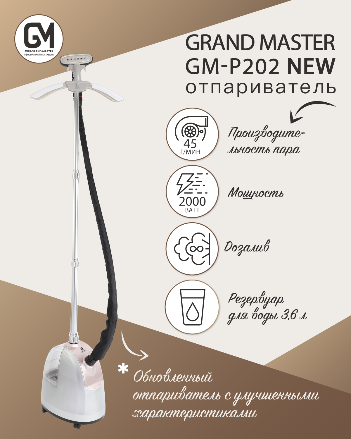 | Дополнительная информация | тефлоновая варежка, приспособление для отпаривания воротника, фирменная сумка с логотипом «Grand Master», плечики, зажим для брюк |