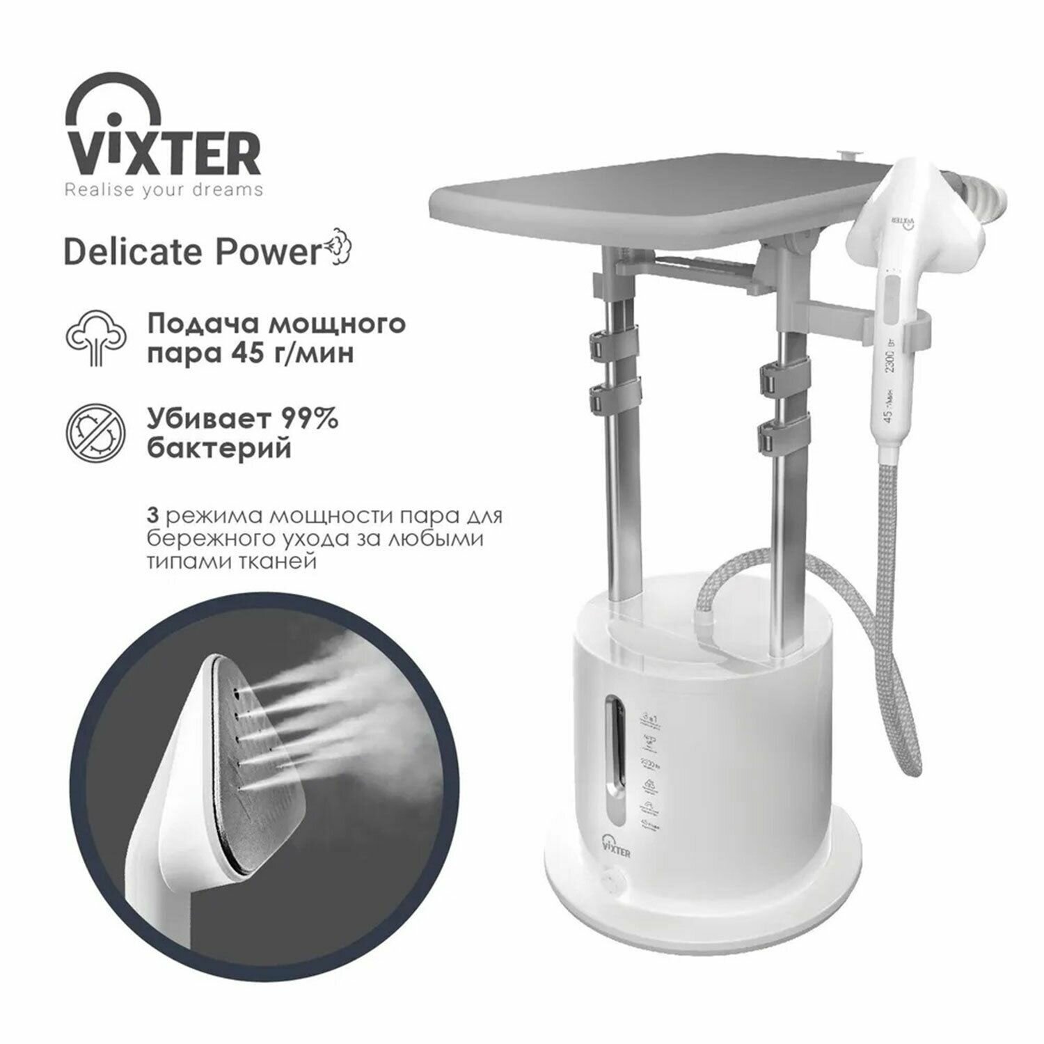 Купить Отпариватель напольный VIXTER GSV-5300 с доской, 2300 Вт, пар 45 г/мин, резервуар 1,7 л, 3 режима, белый с доставкой по всей России.