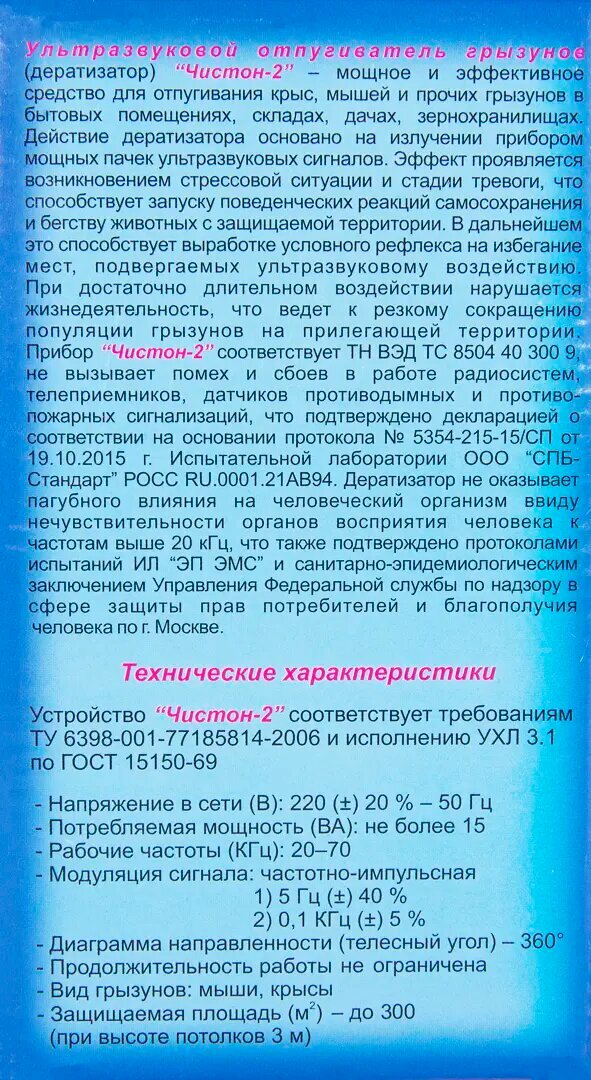 Отпугиватель грызунов «Чистон-2» станет незаменимым помощником в борьбе за чистоту и безопасность частного дома. Он безопасен для человека и домашних животных (исключая грызунов). Рассчитан на площадь воздействия до 300 м2. Принцип работы аппарата основан на мощном ультразвуковом излучении, которое не убивает грызунов, а вызывает неприятные ощущения. Это приводит к тому, что колонии грызунов покидают периметр действия устройства. Преимущества- удобство использования; - высокая эффективность; - малый расход энергии.