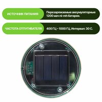 Ультразвуковой импульсный отпугиватель защищает частные дома, дачи и огородные участки от змей, грызунов, кротов и сусликов. Заряд - 24 ч; площадь воздействия: 70 кв. м; частота 400-1000 hz; интервал - 20 с. Работает от солнечной батареи и встроенного аккумулятора емкостью 1200 mAh.
