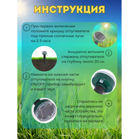 Ультразвуковой отпугиватель для защиты вашей дачи или дома от грызунов, таких как мыши, кроты, крысы, полевки, змеи, медведки и прочие вредители. Это новая модель с увеличенным радиусом действия (20 метров каждый отпугиватель) действует на животных гуманно, используя ультразвук, который не влияют на человека или домашних питомцев. Отпугиватель работает на аккумуляторе, который заряжается от солнца при помощи солнечной батареи и долго держит заряд, благодаря чему прибор будет эффективен даже в плохую и дождливую погоду и с наступлением темноты. Дневного заряда вполне хватит, чтобы проработать всю ночь. Плотность грунта влияет на эффективность работы прибора. Чем плотнее грунт - тем более эффективно будет работать прибор. Прибор создает периодические колебания почвы и звуковой сигнал, который действует на вредителей и отпугивает их. Так же он поможет сохранить Ваш газон на даче или в доме, или в саду. В отличие от традиционных методов, таких как ловушки или яды, отпугиватель безвреден для животных и окружающей среды.