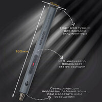 Электрическая аккумуляторная отвертка для точных работ Creation Space выполнена в крепком алюминиевом корпусе цилиндрической формы: удобно ложится в ладонь. Размеры электроотвертки достаточно компактные, она не займет много места. Вокруг головки для бит расположено три светодиода для подсветки рабочего пространства при ремонте в условиях плохой видимости. Электроотвертка обладает продуманной эргономикой, до всех элементов управления легко дотянуться во время работы.