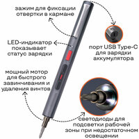 Электрическая отвертка работает от аккумулятора, который заряжается внутри корпуса. Для этого в торцевой части расположен разъем USB Type-C. В комплект вложен зарядный кабель для подключения к сетевому зарядному устройству или повербанку.