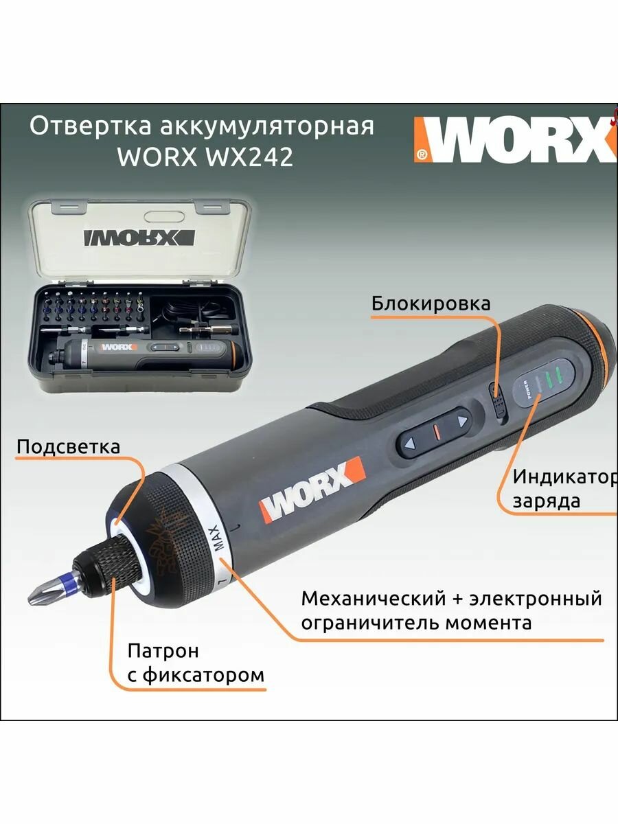 Купить Отвертка аккумуляторная WORX WX242, 4В, 5Нм, 2Ач, набор оснастки. с доставкой по всей России. Отвертка аккумуляторная WORX WX242, 4В, 5Нм, 2Ач, набор оснастки.: сравнение цен, характеристики, фото, актуальное наличие и цены.
