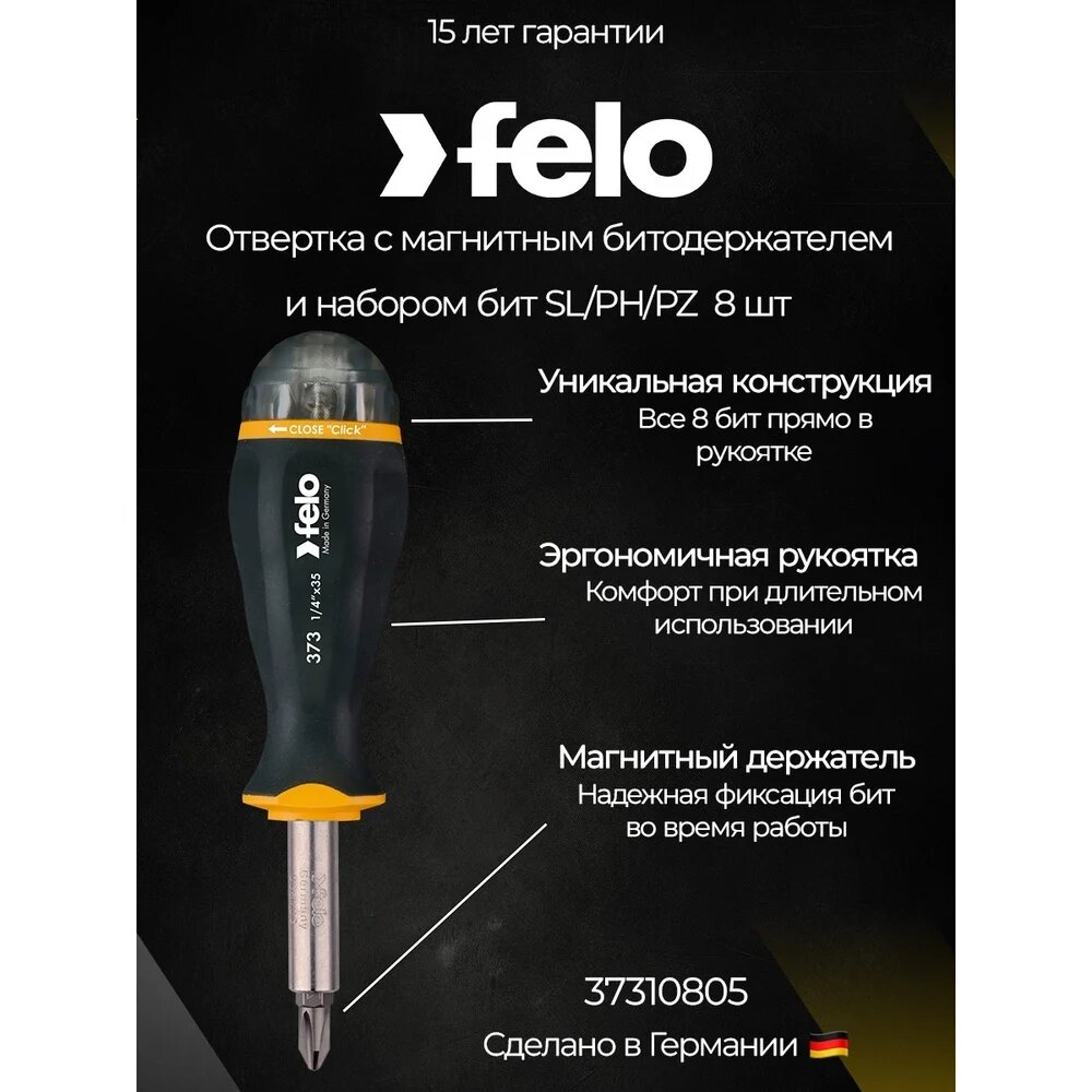 Купить Отвертка Felo с магнитным держателем, с набором бит SL, PH, PZ 8шт 37310805 с доставкой по всей России. Отвертка Felo с магнитным держателем, с набором бит SL, PH, PZ 8шт 37310805: сравнение цен, характеристики, фото, актуальное наличие и цены.