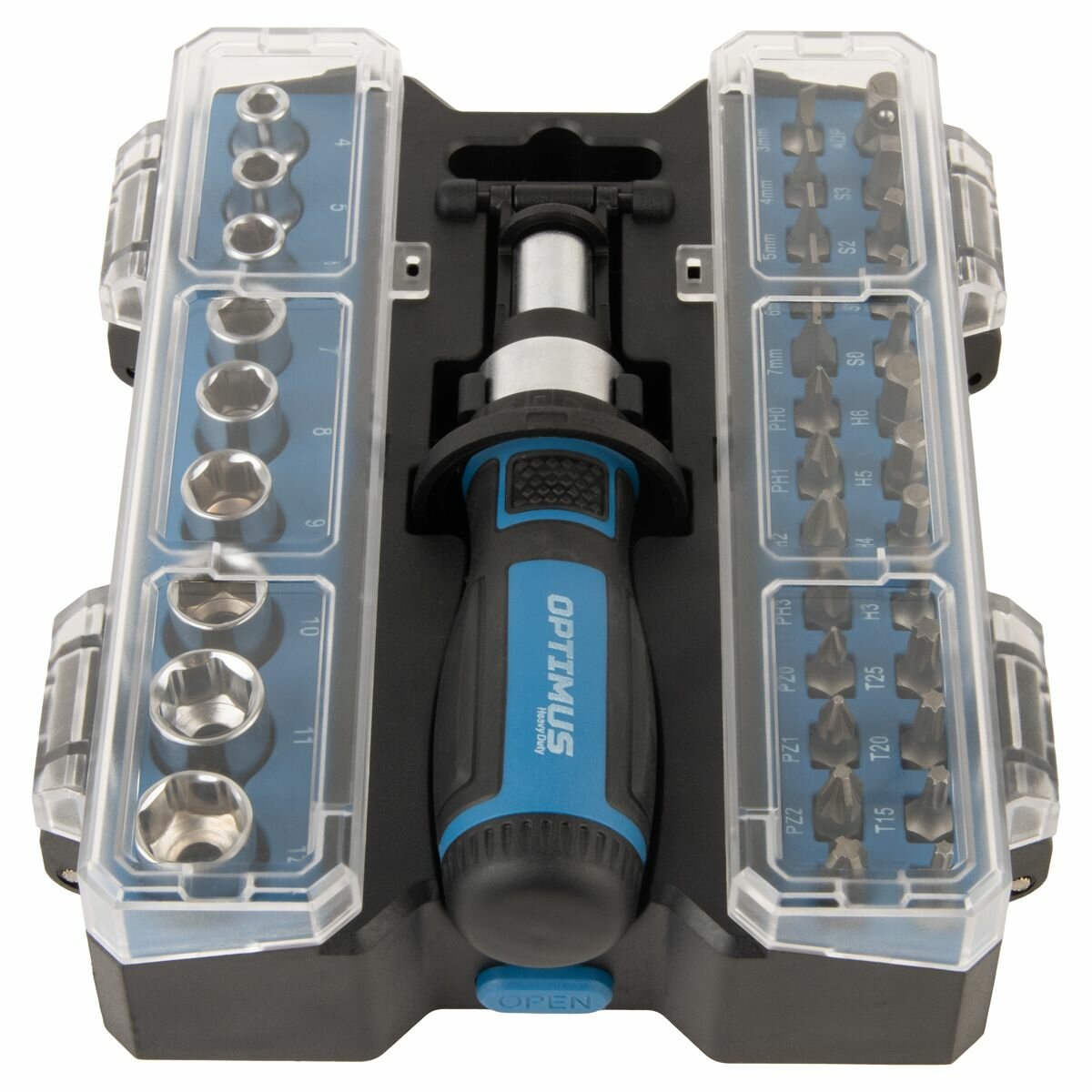 Отвертка реверсивная с набором бит и торцевых головок OPT-BS2036 от Optimus - это профессиональный инструмент, предназначенный для монтажа и демонтажа резьбовых соединений. В комплекте вы получаете 36 предметов, включая отверточную рукоятку с реверсивным механизмом, 19 различных бит и 9 торцевых головок.