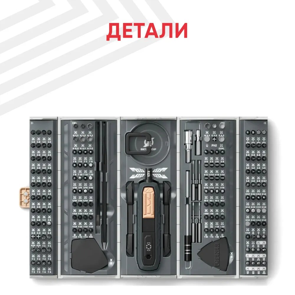 JAKEMY Screwdriver Toolkit (JM-8192) – набор отверток 180 в 1. В комплект входит магнитная рукоятка отвертки, жесткий удлинитель, 2 вида пинцетов, присоска, медиаторы для вскрытия техники, пластиковые лопатки, 162 насадки различного формата из материала S2 и CR-V. Биты крепятся с помощью мощных магнитов, поэтому во время работы они прочно держатся на своем месте. Кейс оснащен углублениями для каждого компонента, благодаря чему мелкие детали не потеряются. Набор подойдет для разборки смартфонов, компьютеров, часов, очков, фотоаппаратов и других устройств.