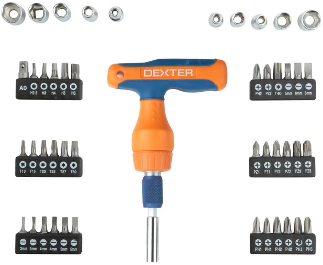 Отвёртка с набором насадок Dexter предназначена для сборки мебели, обслуживания автомобиля, а также ремонта бытового оборудования и техники. Т-образная форма рукоятки позволяет прилагать больше усилий в момент закручивания крепежа. Набор включает в себя шестигранные биты и торцевые головки из износостойкой хромованадиевой стали. Количество предметов — 48.
