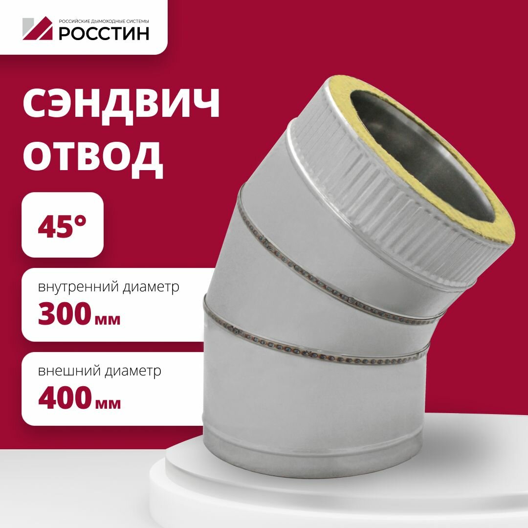 Отвод сэндвич 45 градусов изолированный двухконтурный D300-400 для дымохода из нержавеющей стали AISI 304-0,5 -внутренний контур и AISI 430-0,5 -внешний контур росстин - элемент группы утепленных дымоходов. Предназначен для изменения конфигурации дымохода в плоскости, а также для обхода препятствий на пути ствола дымовой трубы. Изоляция.