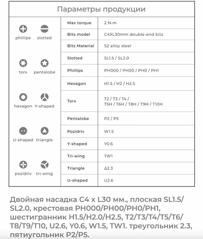 Производитель: Xiaomi Модель: QWLSD004 Тип: отвертка с комплектом бит Биты в наборе: TW1 / 2.3 / Y0.6 / W1.5 / PH1 / SL1.5 / PH0 / SL2.0 / PH00 / P2 / PH000 / P5 / H2.5 / U2.6 / H1.5 / H2.0 / T6 / T8 / T4 / T5 / T3 / T10 / T2 / T9 Размер бит: C4 X L30 мм двусторонние Магнитный способ хранения бит Компактный размер Биты из легированной стали S2 с защитой от коррозии Корпус из прочного алюминиевого сплава Размер: 120 х 16.6 (диам.) мм Вес: 120 г.