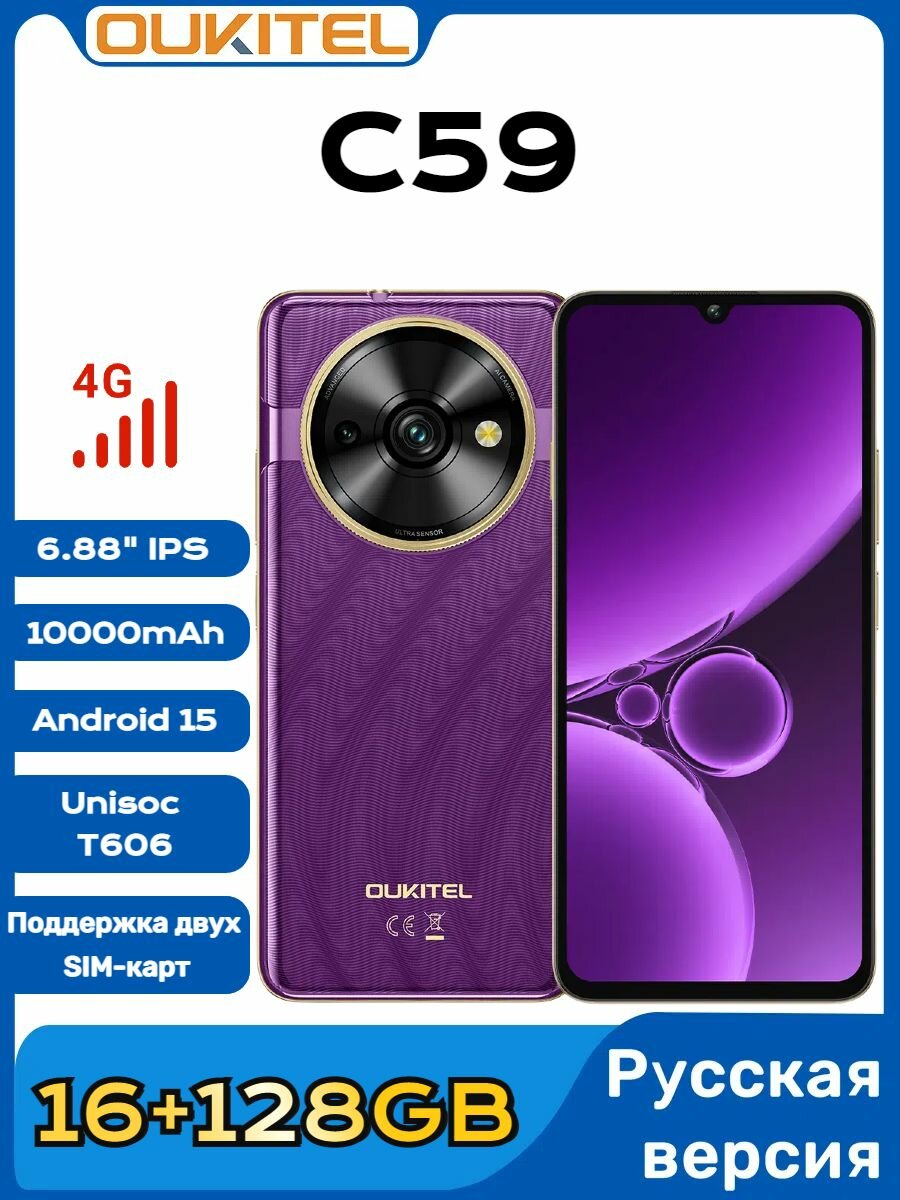 Купить Oukitel Смартфон C59 Мировая версия поддерживает русскоязычные системы Global 16ГБ(4+12)/128 ГБ, Фиолетовый с доставкой по всей России.