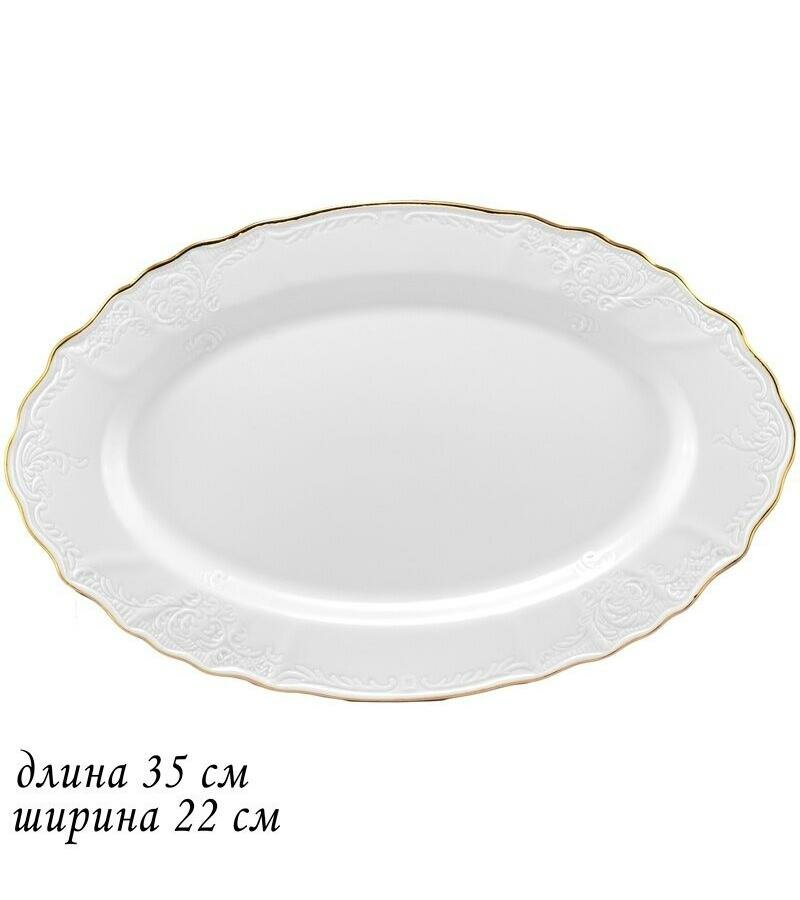 Овальное блюдо 35см подойдет для подачи нарезок среднего размера (фуршетных мясных, сырных, фруктовых), блюд из мяса и овощей. Изделия серии Maria Gold фирмы Lenardi выполнены из тонкого белого фарфора высокого качества - украшены рельефным декором, изящно подчеркивающими благородство фарфора, узорные края выглядят элегантно и всегда в тренде посудной моды, а аккуратная полоска золота придает им очарования. Изделия глянцевые, белоснежные, рисунок на них тактильный, не рисованный, золотая кайма аккуратная. Посуда этой серии хорошо сочетается с любыми тканями – от грубой рогожки до нежного кружева. Подчеркнут благородство серии бокалы из тонкого хрустального стекла. В серию посуды Maria Gold входят тарелки, овальные и прямоугольные блюда, салатники, соусники, наборы для соли и перца, салфетницы, а также заварные чайники, сахарницы, конфетницы, тортовницы, кружки, масленки. Эта серия для тех, кто любит классическую посуду, уместную во все времена. С ее помощью можно полностью сервировать стол. Изделия поставляются в фирменной коробке, а также могут служить отличным подарком.