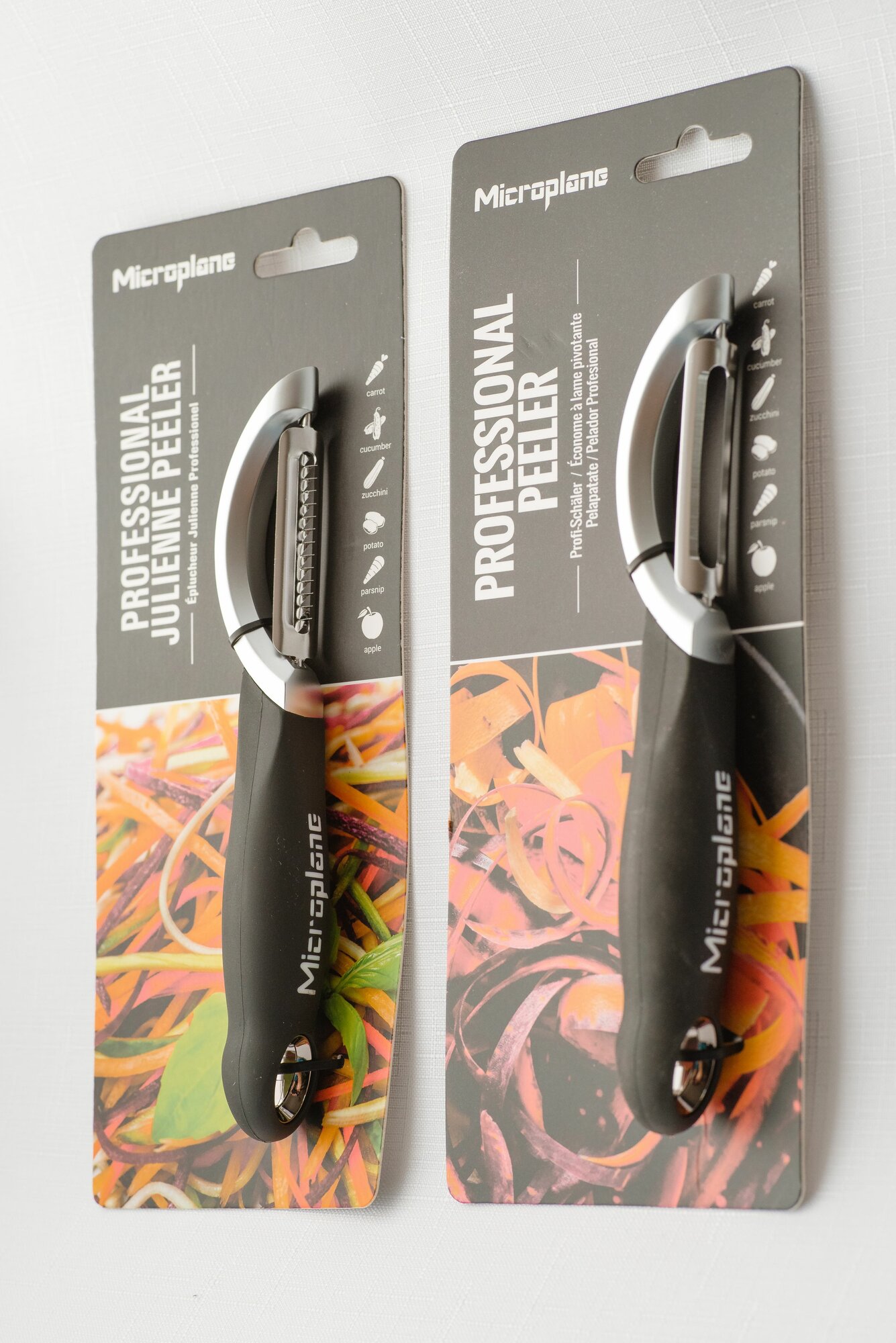 Поворотная фрукто-овощечистка Microplane оснащена очень острым универсальным инструментом, который отлично подходит для картофеля, яблок и моркови, не прилагая особых усилий!