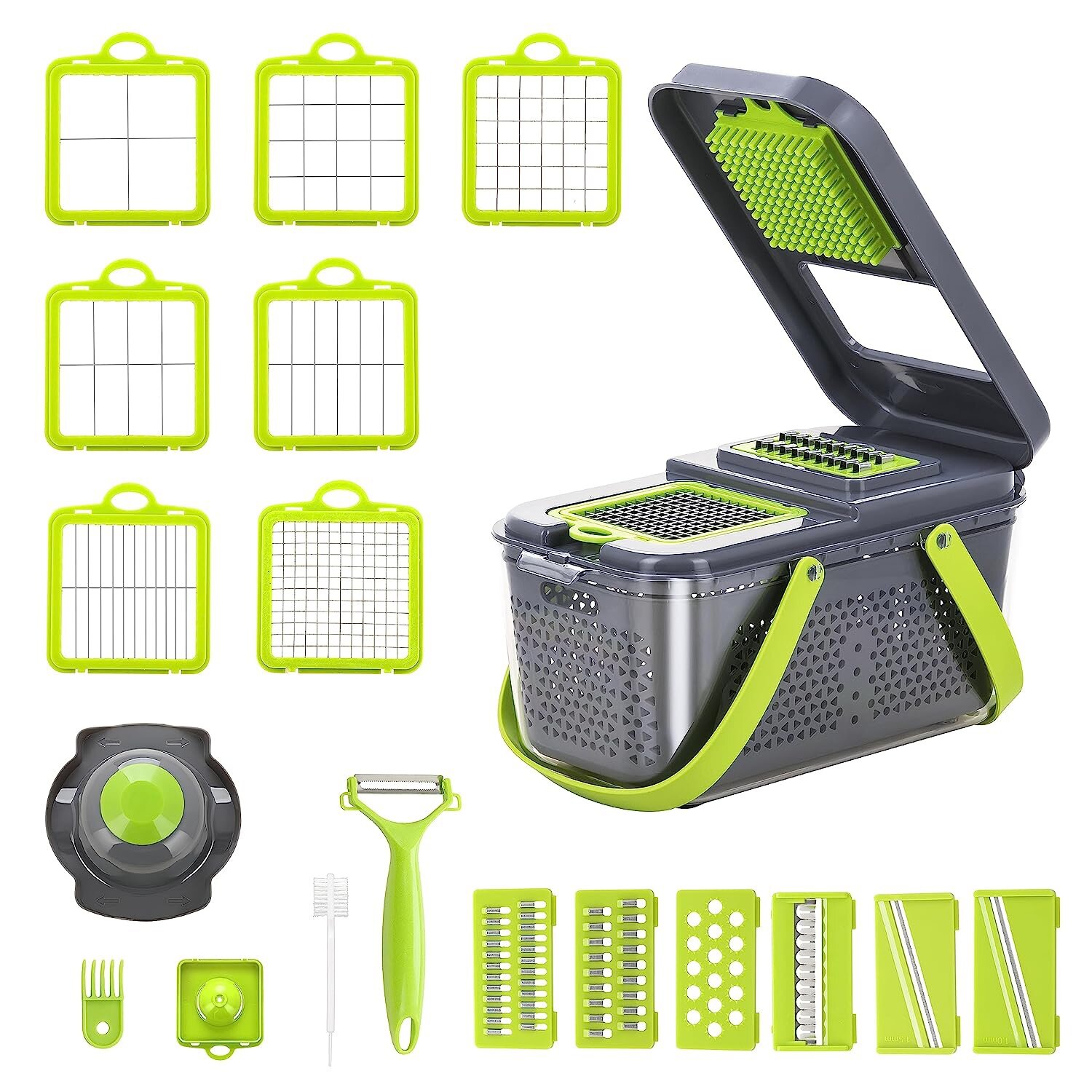 Насадки - 13 шт.,; Контейнер для сушки овощей с разделителем - 1 шт.,; Пластиковый контейнер для хранения с крышкой - 1 шт; Плододержатель - 1 шт., сепаратор для яиц - 1 шт., овощечистка - 1 шт.,; Маленький контейнер для хранения насадок - 1 шт,, кисточка для очистки - 1 шт