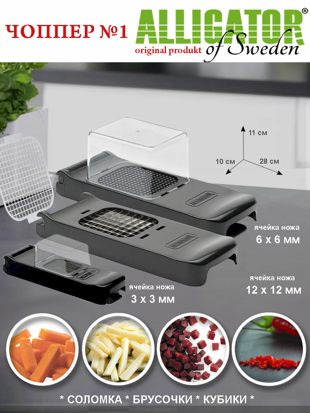 Овощерезка Alligator Chopper 6х6 мм с боксом и зубочисткой, допрезак 12х12 мм с боксом, овощерезка Alligator Chopper mini 3х3 мм с боксом и зубочисткой