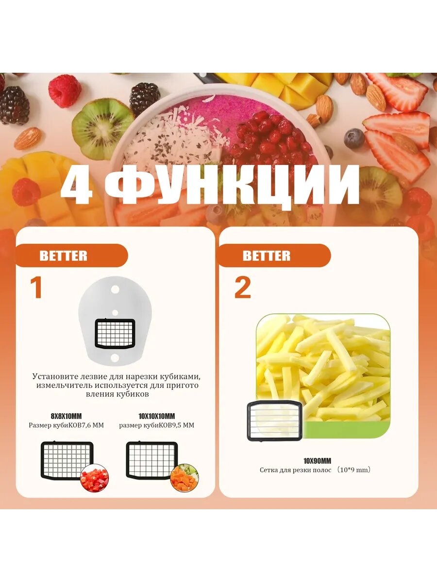 тот измельчитель кухонный электрический с набором из нержавеющих лезвий для нарезки кубиками, ломтями и измельчения продуктов идеально подходит для нарезки овощей, фруктов, сыра и других продуктов. Мощный мотор (200 Вт) обеспечивает быстрый и эффективный процесс нарезки, экономя ваше время.