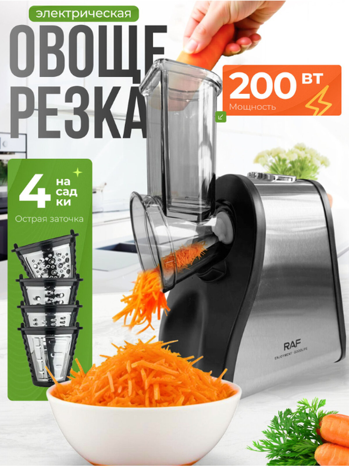 Овощерезка электрическая для овощей c насадками многофункциональная RAF.3390: сравнение цен, характеристики, фото, актуальное наличие и цены.