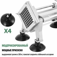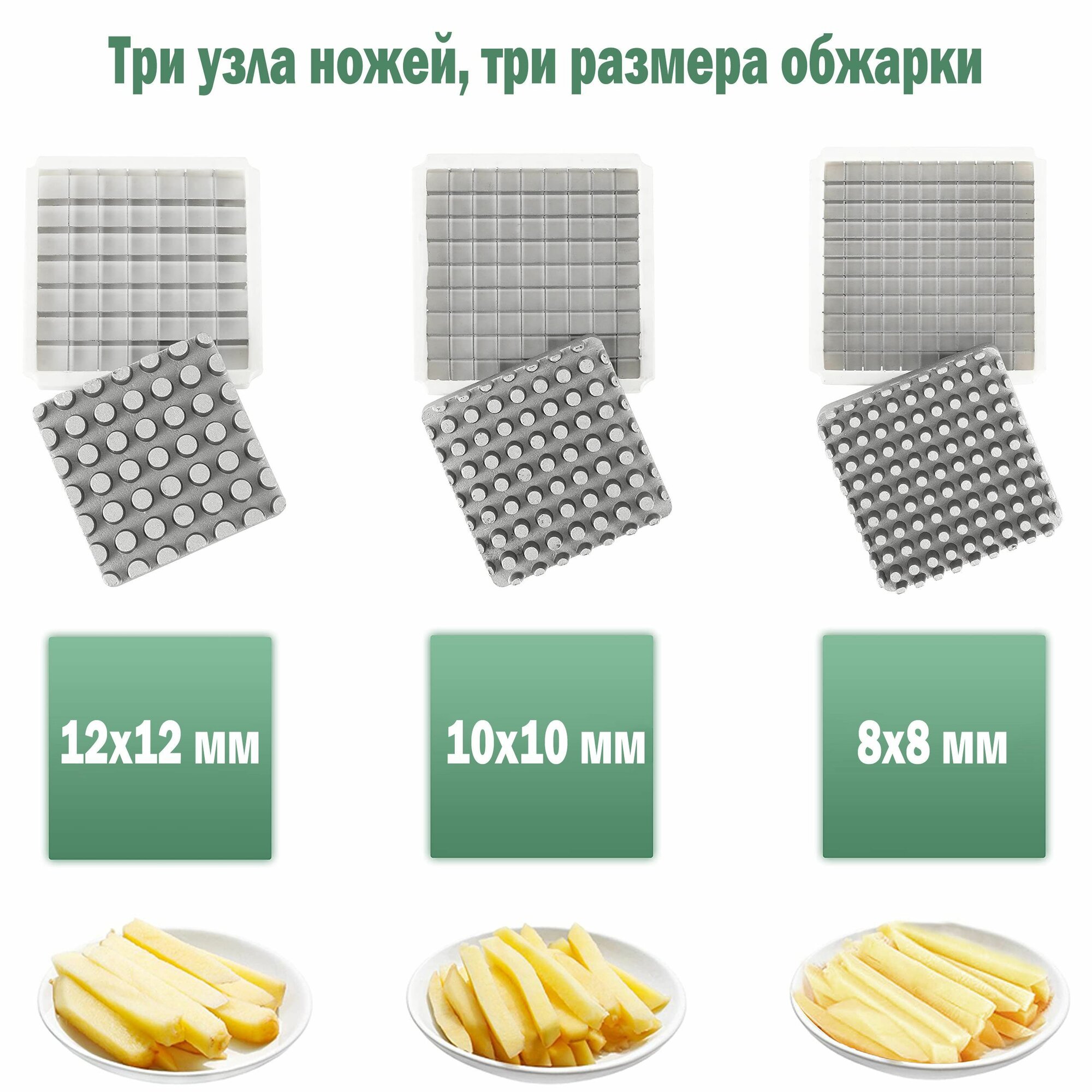 Картофелерезка * 1; Лезвие из нержавеющей стали (8x8 мм) * 1; Лезвие из нержавеющей стали (10x10 мм) * 1; Лезвие из нержавеющей стали (12x12 мм) * 1; Присоски * 4;