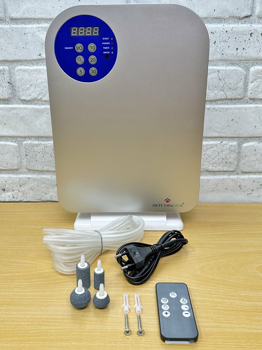 Бытовой генератор озона Rottinger с производительностью выработки озона не менее 700 мг/час. Получаемый озон используется для дезинфекции, устранения микробов и запахов, оздоровления и очистки помещений. Цифровой таймер, часы, пульт ДУ и сенсорные кнопки для ручного управления позволяют пользоваться прибором с максимальным удобством.
