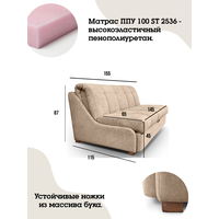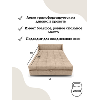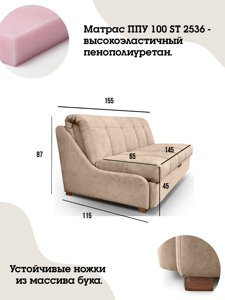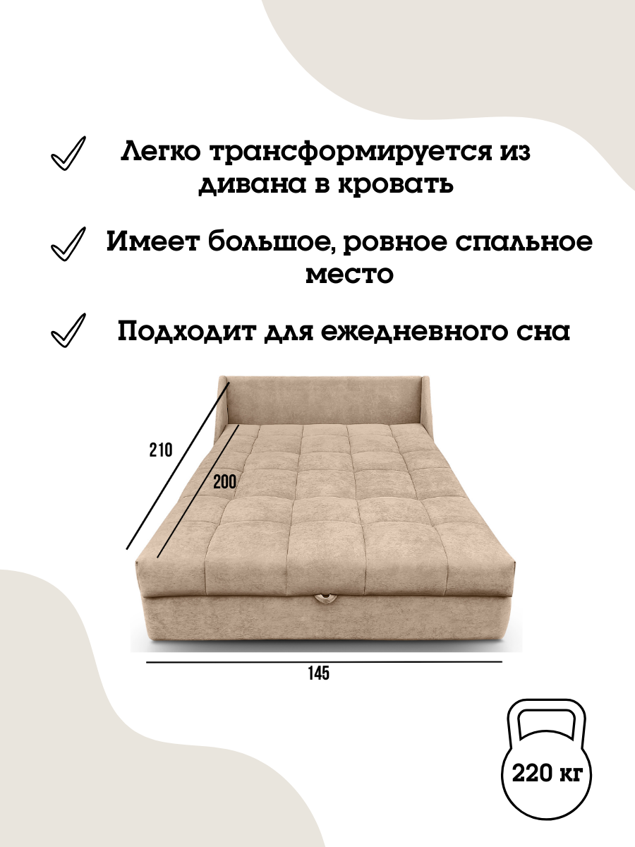 Встроенный механизм аккордеон эффектно и быстро превращает зону для отдыха и сна в просторное спальное место размером 145х115х87 см. В разложенном виде мебель может использоваться как ортопедическая кровать для подростка или ребенка. Обратите внимание, что максимально допустимая нагрузка — 220 кг, основание выдерживает вес 2-х взрослых людей.