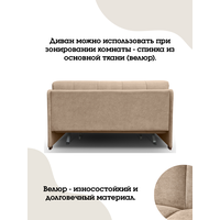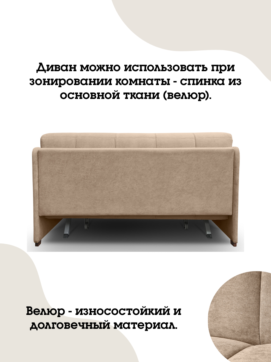 Безопасный состав используемых материалов не вредит здоровью, поэтому устойчивый раскладной диван на ножках подходит даже для маленьких детей. Мебель без подлокотников из натурального бука и мягкого велюра сохраняет оттенок ткани и привлекательный вид даже через несколько лет эксплуатации. Износостойкий велюр не растягивается со временем, легко очищается от шерсти животных и загрязнений.
