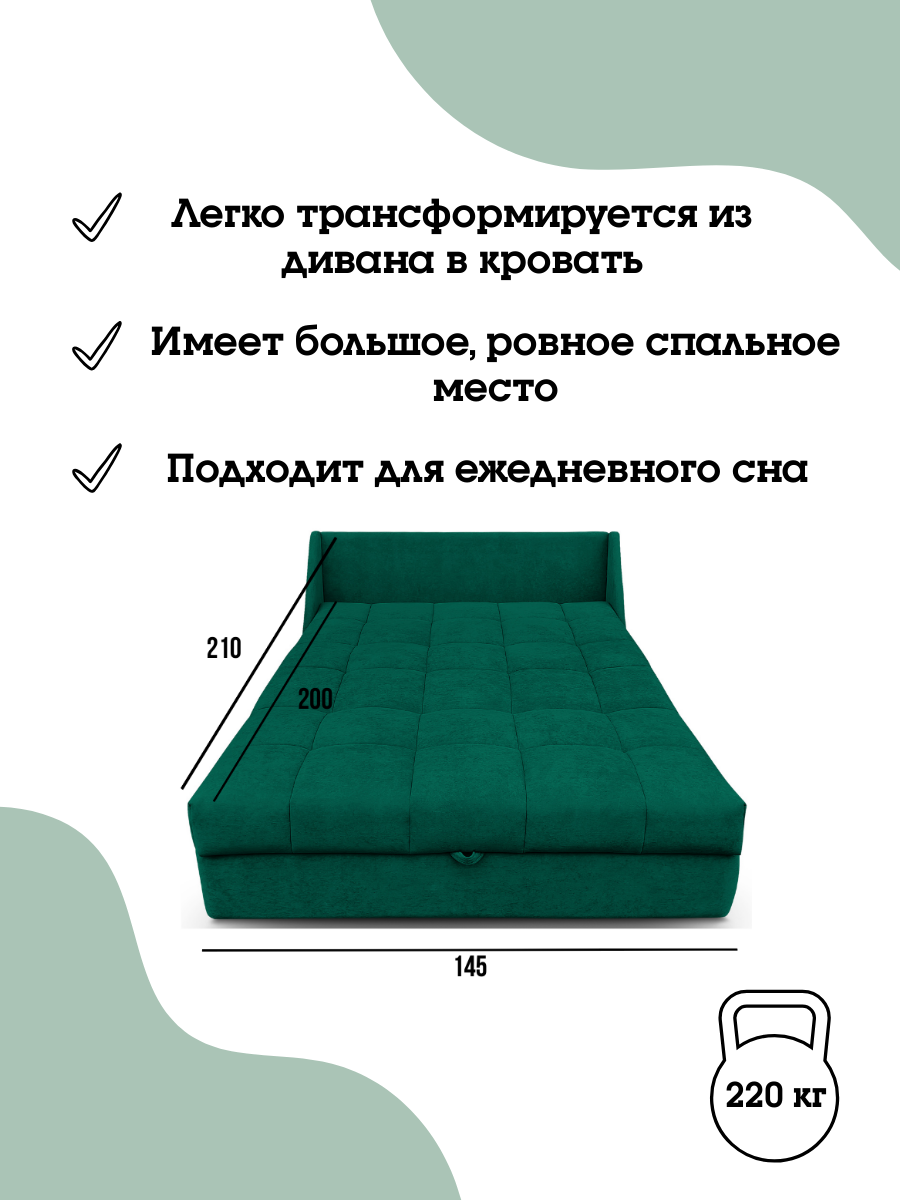 Встроенный механизм аккордеон эффектно и быстро превращает зону для отдыха и сна в просторное спальное место размером 145х115х87 см. В разложенном виде мебель может использоваться как ортопедическая кровать для подростка или ребенка. Обратите внимание, что максимально допустимая нагрузка — 180 кг, основание выдерживает вес 2-х взрослых людей.