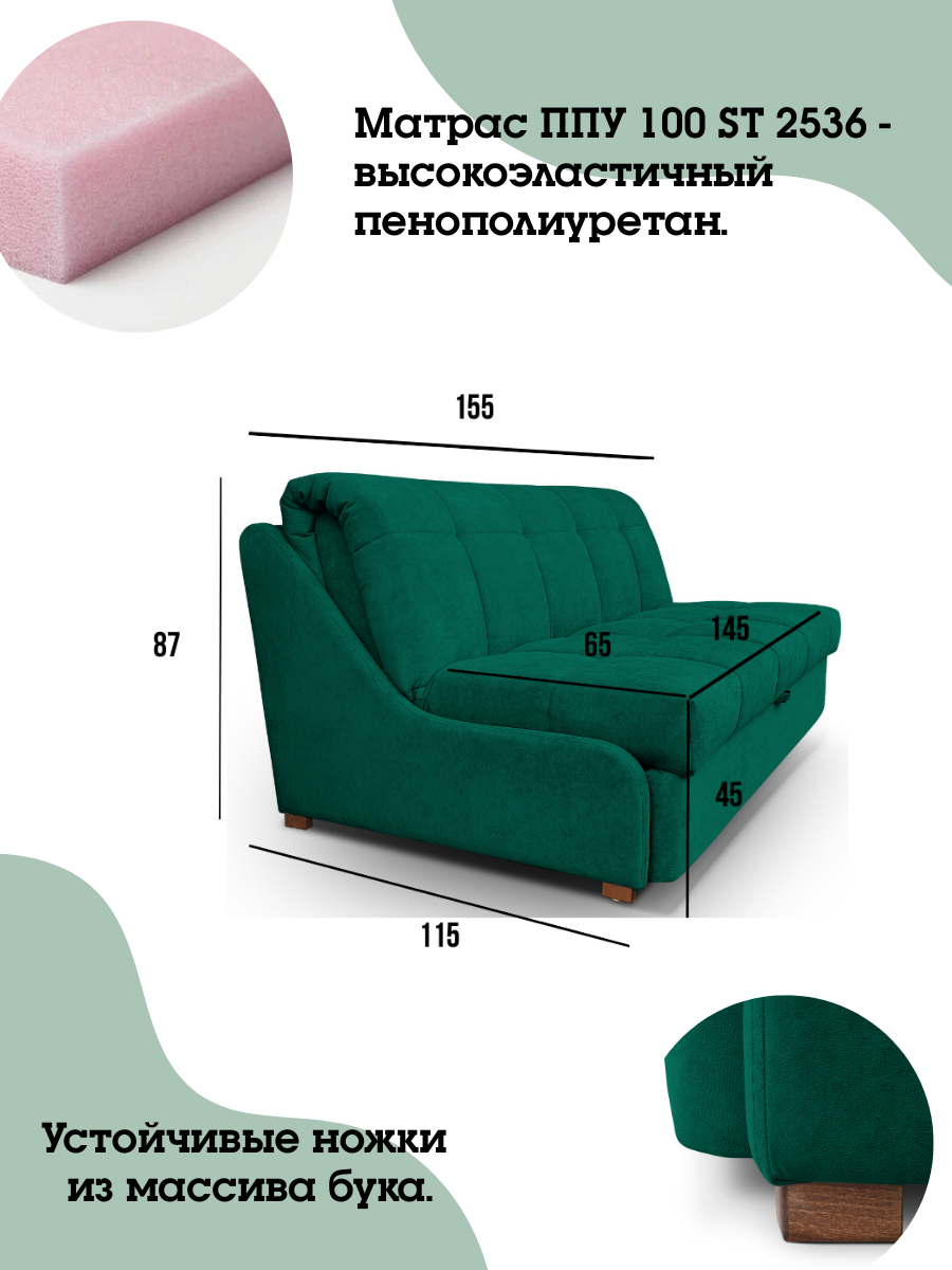 Безопасный состав используемых материалов не вредит здоровью, поэтому устойчивый раскладной диван на ножках подходит даже для маленьких детей. Мебель без подлокотников из натурального бука и мягкого велюра сохраняет оттенок ткани и привлекательный вид даже через несколько лет эксплуатации. Износостойкий велюр не растягивается со временем, легко очищается от шерсти животных и загрязнений.