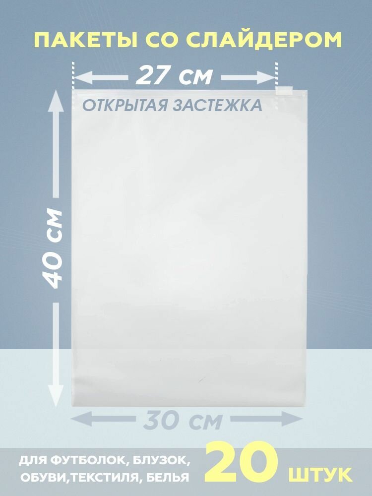 Пакеты с застежкой (бегунком) для одежды 300х400 мм 50 мкм 20 штук, матовые: сравнение цен, характеристики, фото, актуальное наличие и цены.