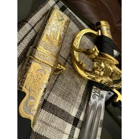 сделаны из дерева, обтянуты кожей, прибор выполнен из полированной латуни, нанесение никеля и золота 999.9 пробы. Художественные гравировки ручной работы выполнены на всех деталях ножен (прибор состоит из устья, гайки и наконечника), к гайке и устью прикреплены подвижные кольца для крепления палаша к портупее.