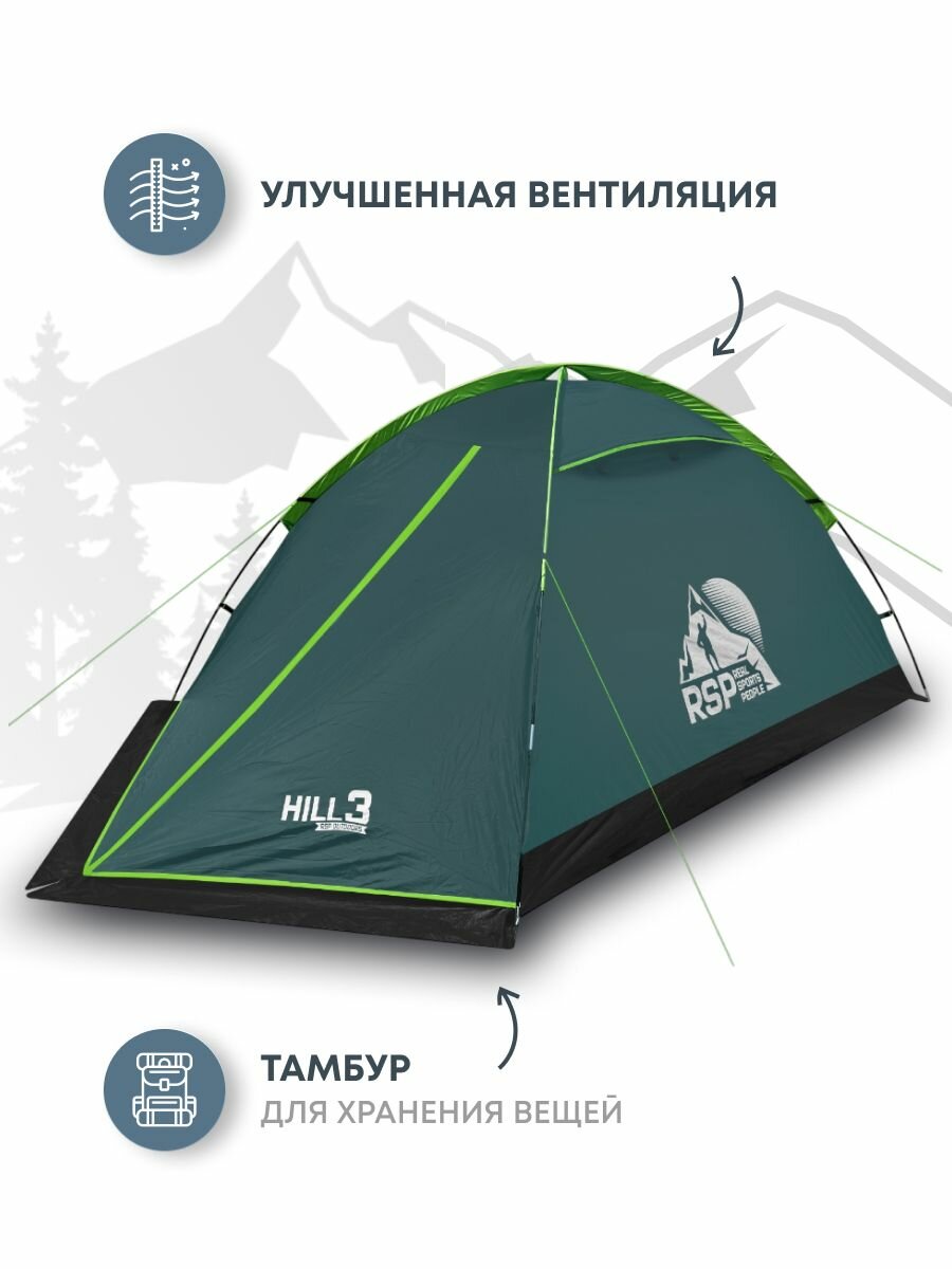 RSP Hill 3 - палатка с тамбуром. В нем вы сможете расположить свои вещи и обувь, а благодаря снежной «юбке» вы и ваши вещи будут надежно защищены от непогоды, насекомых и змей. Палатка туристическая с тамбуром обладает широким функционалом.