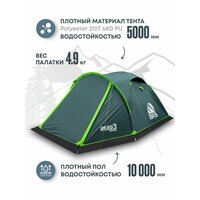 Тент палатки для туризма 3 местная изготовлен из прочного и в то же время легкого материала Polyester 210T 68D с показателем водонепроницаемости 5000 мм. водного столба, что является очень высоким показателем и способен выдержать любой дождь. Тент палатки имеет пропитку задерживающую распространение огня. Дно палатки изготовлено из армированного полиэтилена – терпаулинга, который является очень крепким материалом показателем водонепроницаемости 10 000 мм. водного столба. Палатка 3 х-местная водонепроницаемая, а значит вы сможете наслаждаться отдыхом в любую погоду. Кроме того, палатки для туризма двухслойные подходят для путешествий в любое время года.