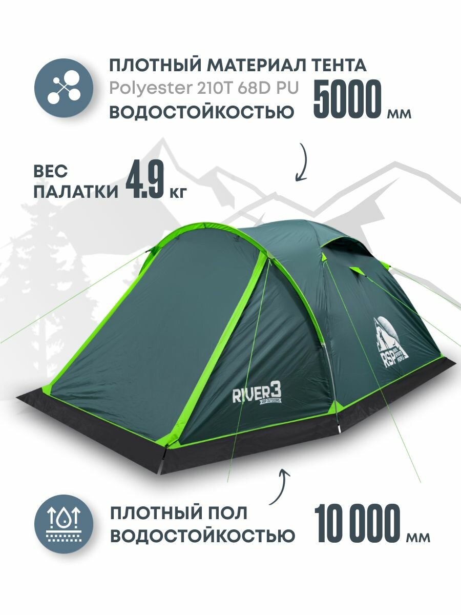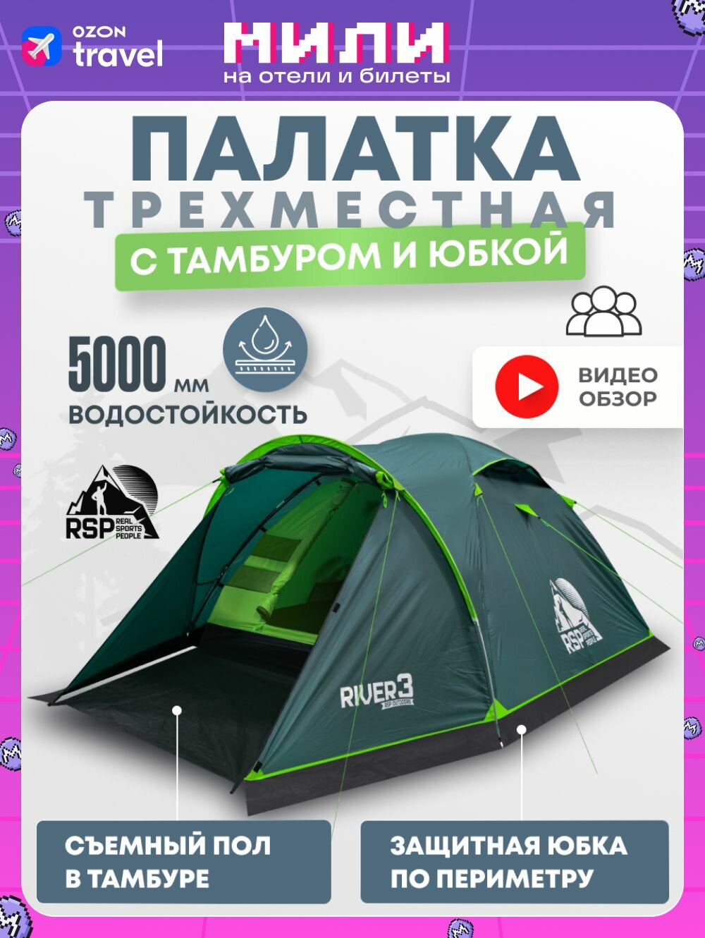Походные палатки - незаменимое снаряжение любителей путешествий и активного отдыха. Палатка туристическая 3 местная двухслойная с тамбуром RSP River 3 была разработана как для туристических походов средней сложности, так и отдыха с семьей на природе в любое время года. За счет маленького веса и небольших габаритов в сложенном виде палатка туристическая 3 местная с тамбуром пользуется большой популярностью для пеших походов, а также вело и мото путешествий.