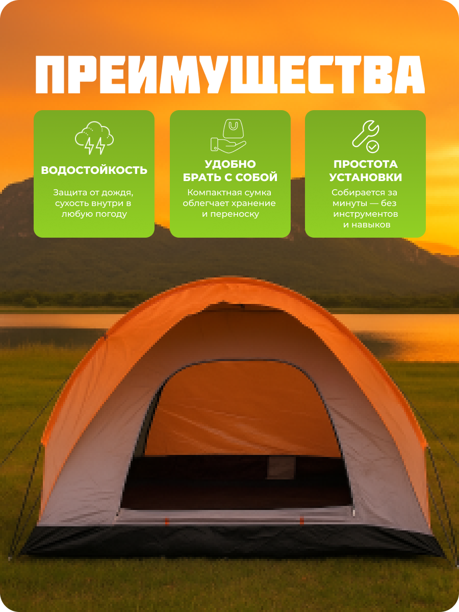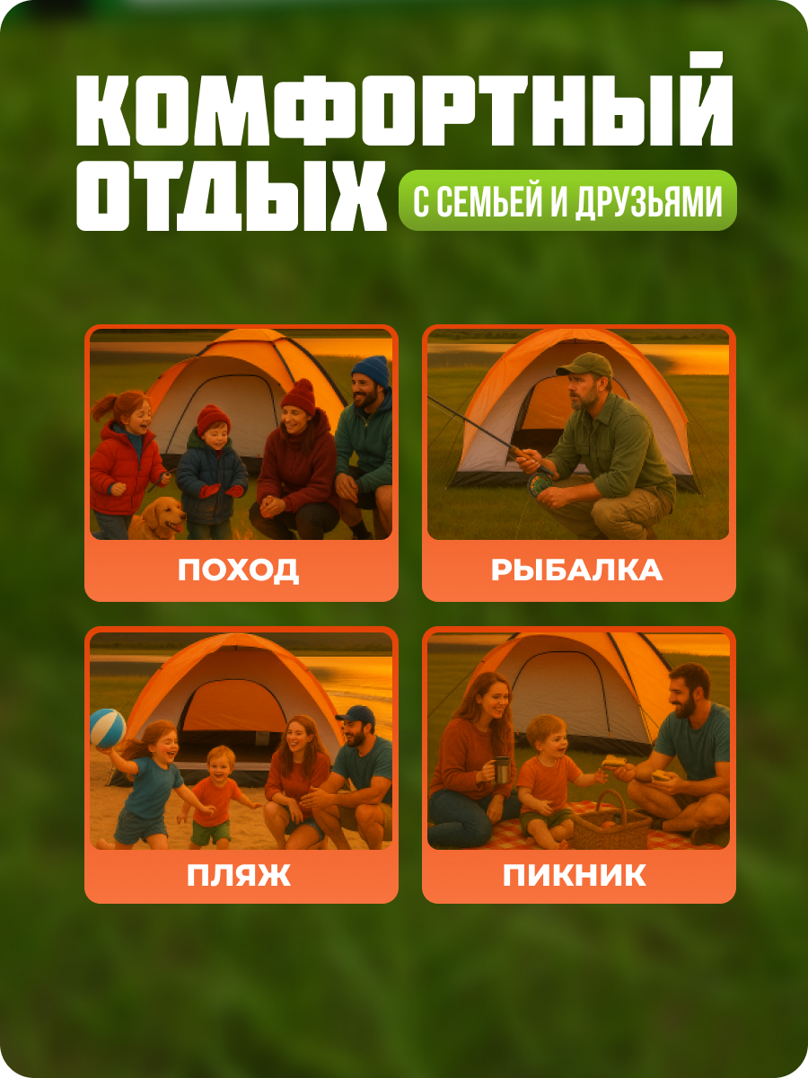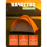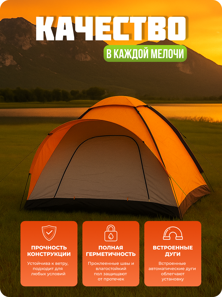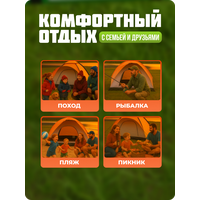 Палатка для кемпинга и туризма с тамбуром — идеальный вариант для комфортного отдыха на природе. Она состоит из двух отдельных зон: тамбура и спального отсека. В тамбуре можно разместить место для приготовления пищи и приёма еды, а также оставлять обувь и другие вещи. Благодаря противоштормовым оттяжкам, вы сможете спокойно спать даже в плохую погоду. Эта палатка легко устанавливается и собирается за короткое время. Основные преимущества палатки — прочные дуги и водоотталкивающий материал, который не пропускает ветер. Также имеется противомоскитная сетка в вентиляционном отверстии. Внешний тент изготовлен из полиэстера с высокой влагоустойчивостью. Внутренний слой выполнен из дышащего полиэстера, который поддерживает оптимальный микроклимат внутри палатки. Все швы тщательно проклеены и обработаны специальной лентой, что гарантирует отсутствие протечек даже при сильных ливнях. Пол также изготовлен из непромокаемого материала. Палатка поставляется в небольшой сумке-переноске, что облегчает её хранение и транспортировку. Отправляйтесь в путешествие и наслаждайтесь положительными эмоциями от отдыха в лесу, рыбалки и охоты!